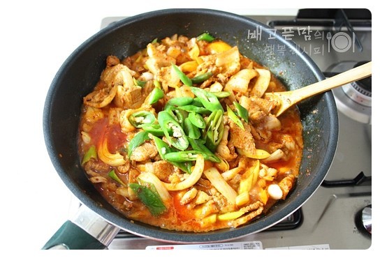 그리고 마지막으로 청양고추 3개를 어슷썰어 넣고 볶아 주었습니다.