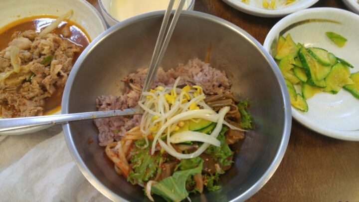 비빔밥으로 먹을수 있게 비빔그릇에 밥을 줍니다