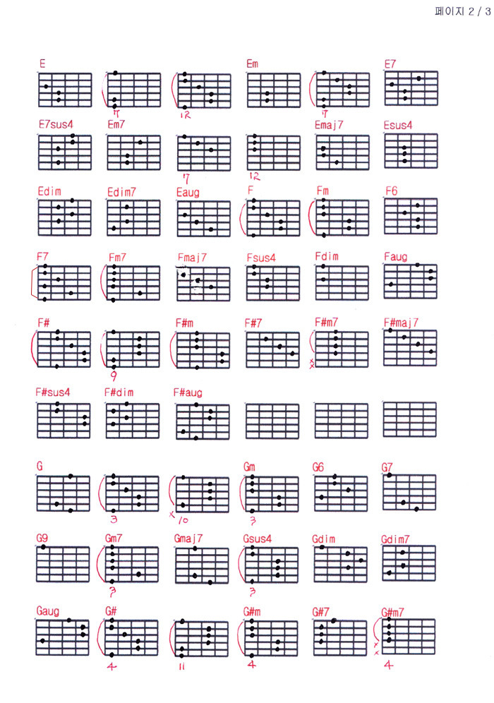 악보 상단 또는 하단에 붙여 연주 하면서 숙지 하시면 코드를 빨리 익힐수 있습니다.