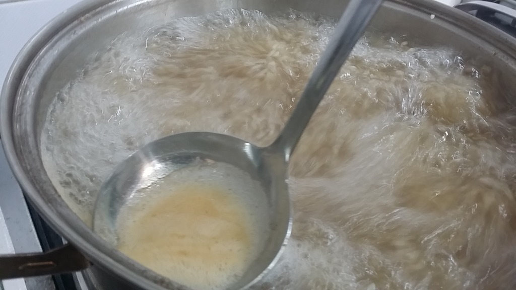 위로 끊어오르는 거품을 걷어줍니다.