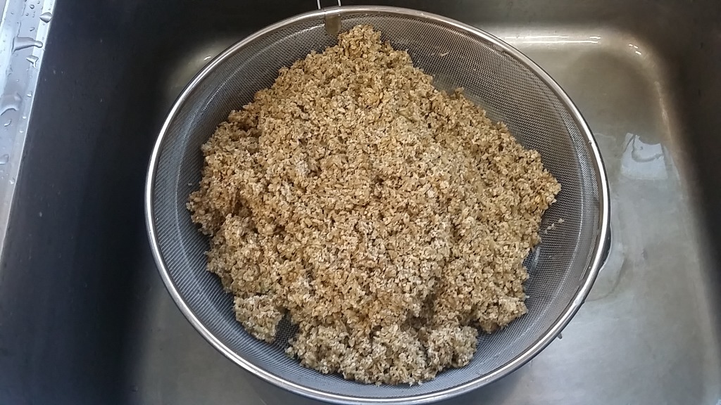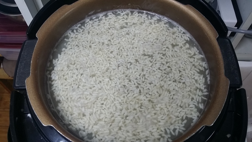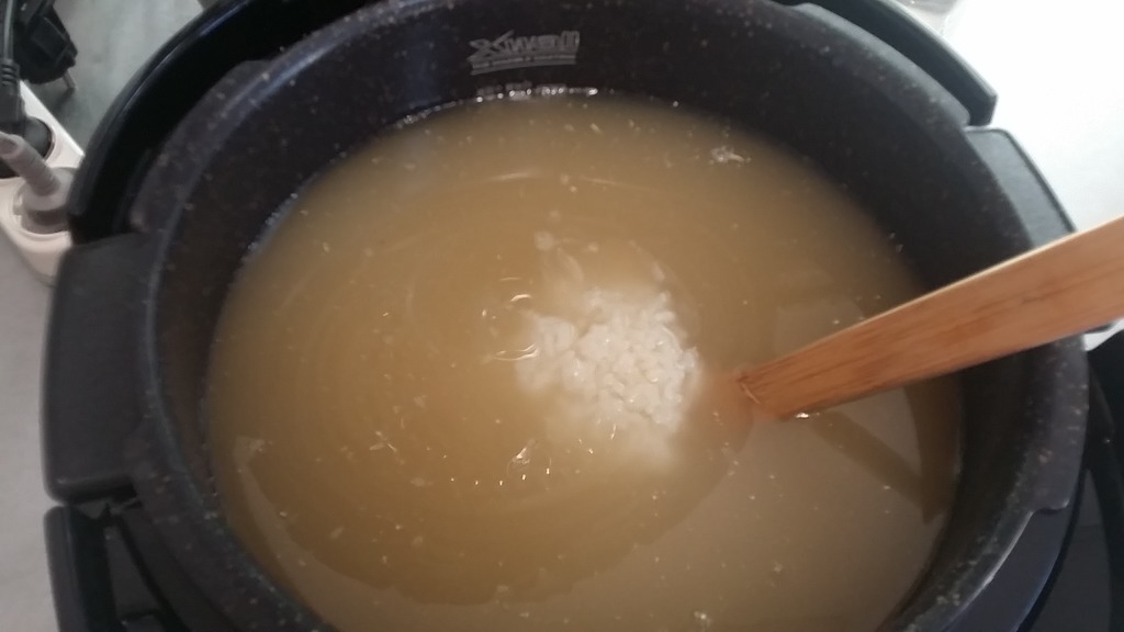 이것을 갈아앉혀서 윗물만 밥솥에 부어서 삭힙니다.