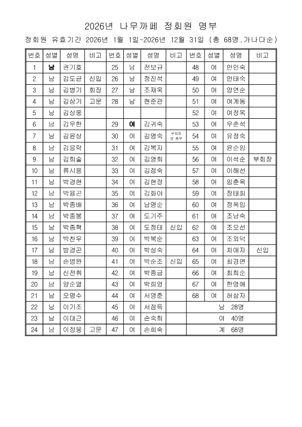 2026년 나무카페 정회원 명부 작성자김명숙|작성시간25.12.27|조회수256 목록 댓글 4 글자크기 작게가 글자크기 크게가 안녕하세요?어느새 2026년을 맞이하게 되었습니다.2026년 정회원 명부를 확인하시기 바라오며새해에 뵙겠습니다.김명숙 드림 다음검색 현재 게시글 추가 기능 열기 북마크 신고 센터로 신고 댓글 댓글 4 댓글쓰기 답글쓰기 댓글 리스트 작성자홍집2 | 작성시간 25.12.28 신입 회원들의 가입을 환영합니다. 명단을 정리하고 게시하면서 수고하시는 총무 김 명숙 선생님께찬사의 박수를 보냅니다. 감사합니다. 작성자이팝나무 | 작성시간 25.12.28 즐거운 마음으로 새해 뵈옵기를 기대합니다. 작성자이석순 | 작성시간 25.12.28 부회장님,수고 많으셨습니다.그리고 신입회원 반갑습니다. 작성자최경연 | 작성시간 25.12.29 내년 한해도 즐겁고 보람된 탐방이 기대 됩니다.수고 많으시고 감사합니다 . 댓글 전체보기