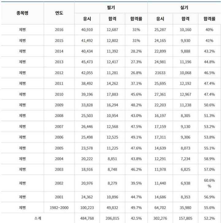 제빵기능사 필기와 실기시험 합격률
