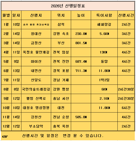 2026년 산행일정표 작성자이윤구|작성시간26.04.03|조회수54 목록 댓글 0 글자크기 작게가 글자크기 크게가 다음검색 현재 게시글 추가 기능 열기 북마크 공유하기 신고 센터로 신고 댓글 댓글 0 댓글쓰기 답글쓰기 댓글 리스트