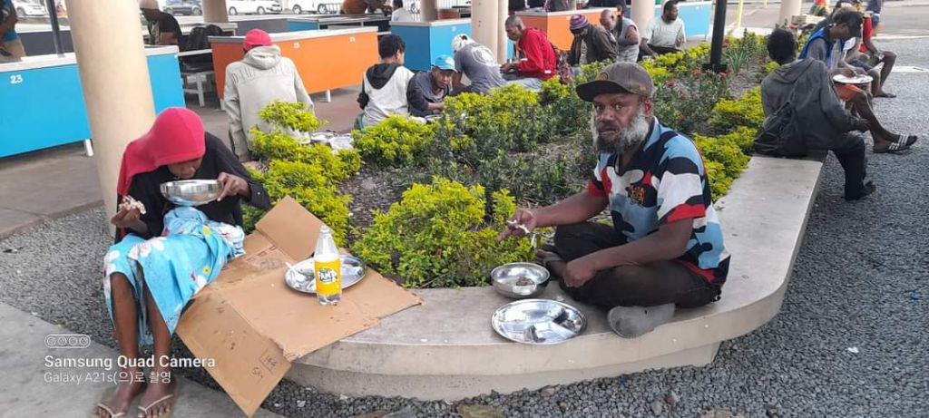 세상에 가장 낮은 자들은 오늘도 따뜻한 밥 한 그릇을 받아 들고 화단에 앉아서 허기진 배를 채우고 있다.
