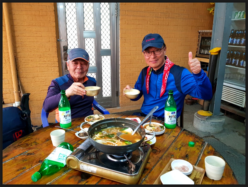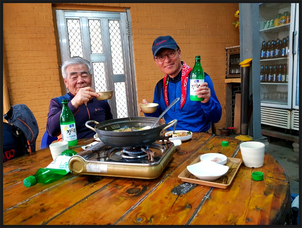 팔당역 가기 전 운길산-예봉산 코스 하산시 항상 들르던 두부전골집에서 이번에도 하산 뒤풀이로 시원하고 얼큰한 국물 맛과 어우러진 담백한 두부전골에 시간 가는 줄 모르고 3시간여 장수막걸리 5병이 비워진다. 14km, 11시간 중 산행시간 5시간, 휴식 및 점심 2시간반, 하산뒤풀이 3시간이다. 산행을 한건지 막걸리를 마시러 간건지 아리송한 즐거운 산행이다.