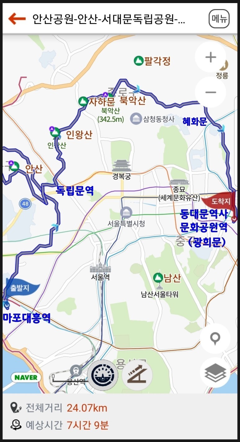 ☞ 코스 : 마포대흥역(09:05)-안산자락길입구(09:54/4.2km)-메타세콰이어숲(10:37/7.7km)-안산무악봉수대(10:55/8.8km)-독립문역.서대문형무소(11:45-11:54/12.4km)-국사당(12:08/13.2km)-인왕산(12:37/14.3km)-창의문안내소(13:15/16.1km)-북악산(13:49/17.0km)-숙정문(14:12/18.1km)-말바우안내소(14:19/18.5km)-혜화문(15:01/21.1km)-낙산공원(15:25/22.3km)-동대문(흥인지문15:47/23.7km)-광희문.동대문역사문화공원(16:05/24.8km)