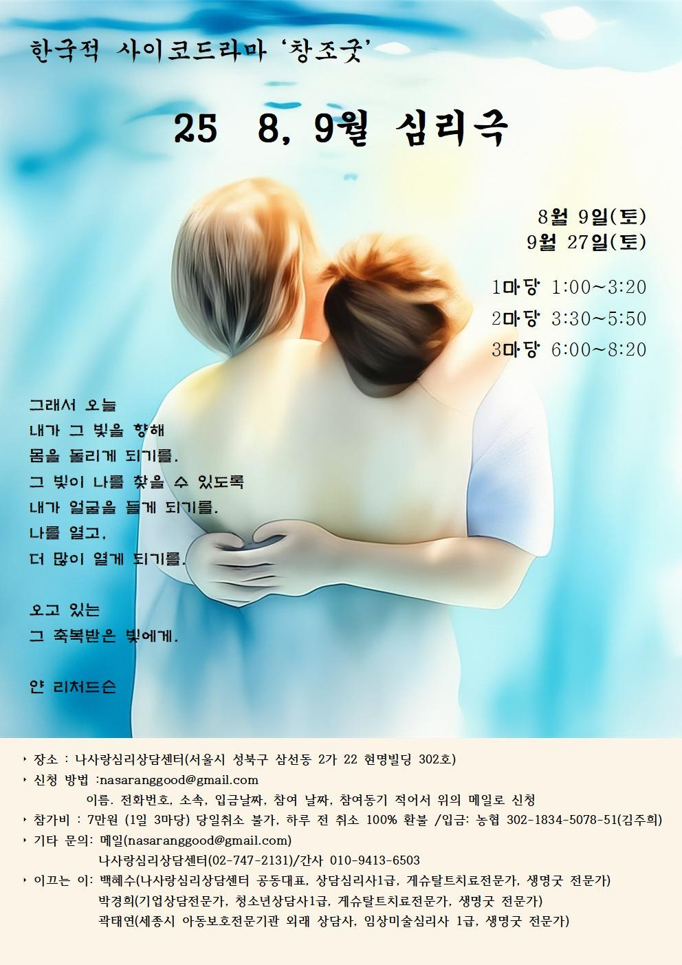 *창조굿 신청시, 15시간이상 참석과 주인공 1회 참여시에는 한국상담심리학회 집단상담 수련시간으로 인정됩니다.