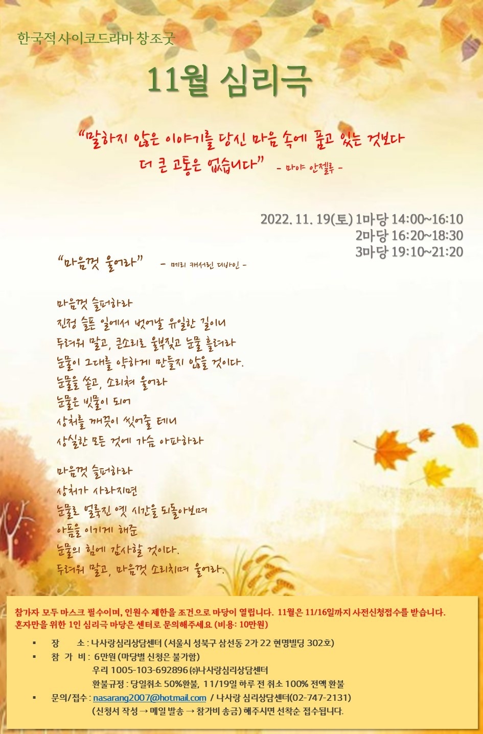 <나사랑심리상담센터> 한국적 사이코 드라마 "창조굿" 11월 안내