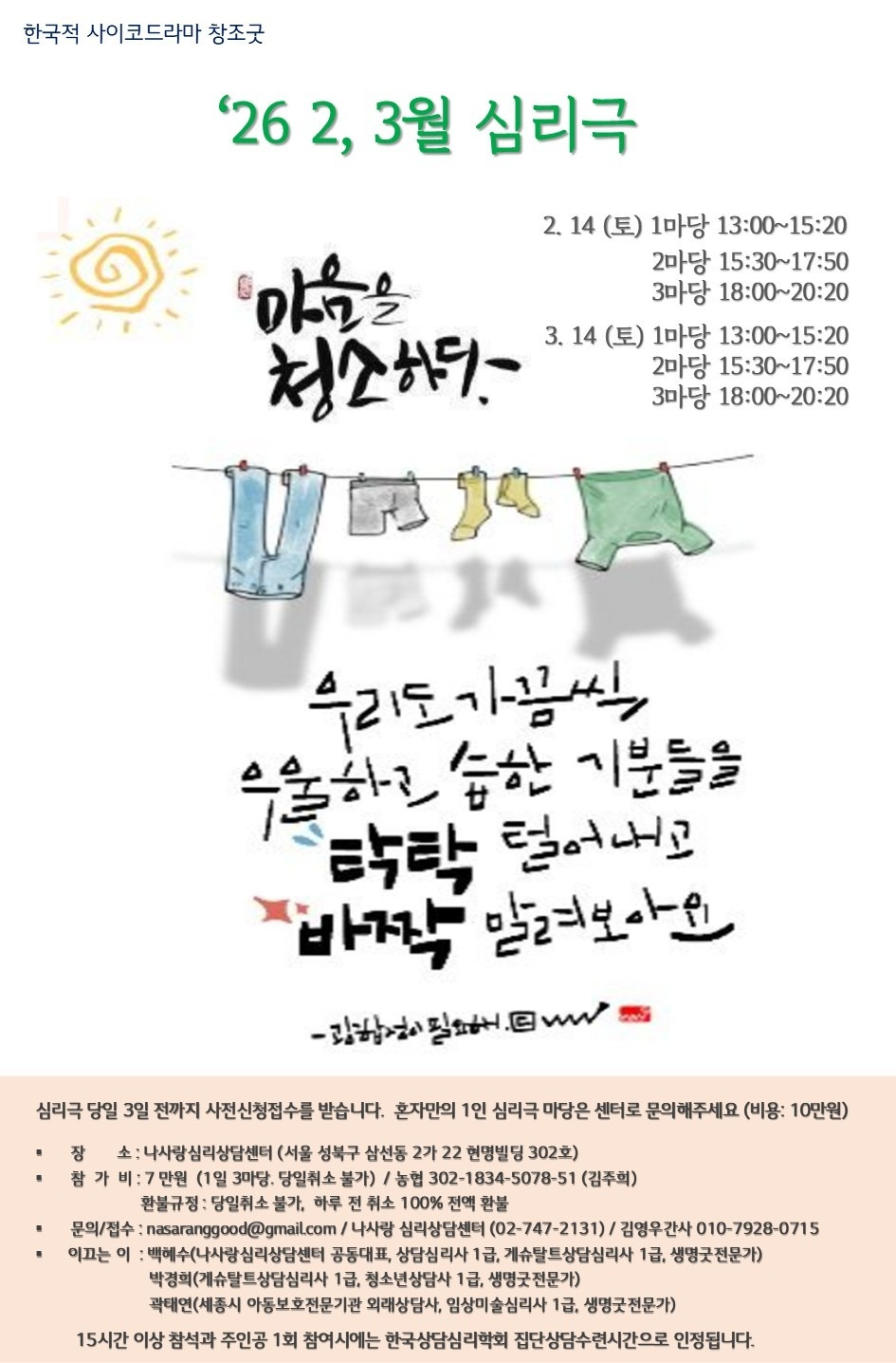 *창조굿 신청시, 15시간이상 참석과 주인공 1회 참여시에는 한국상담심리학회 집단상담 수련시간으로 인정됩니다.