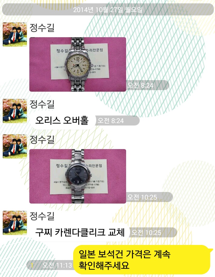 시계수리 완료사진은 아버지께서 직접 매장에서 사진촬영 후 아들인 저에게 전송해 주시면 제가 편집하여