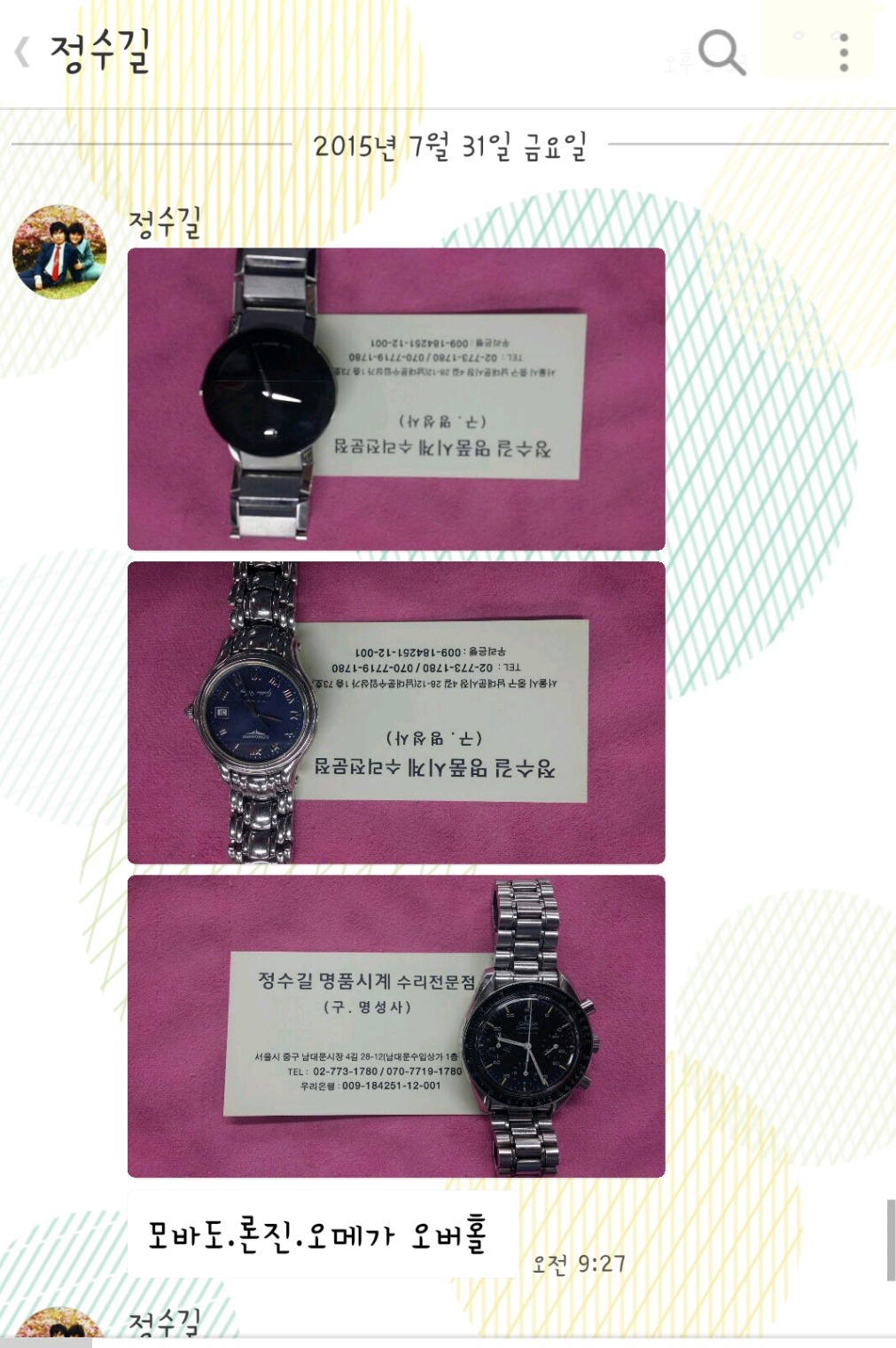 시계수리 완료사진은 아버지께서 직접 매장에서 사진촬영 후 아들인 저에게 전송해 주시면 제가 편집하여
