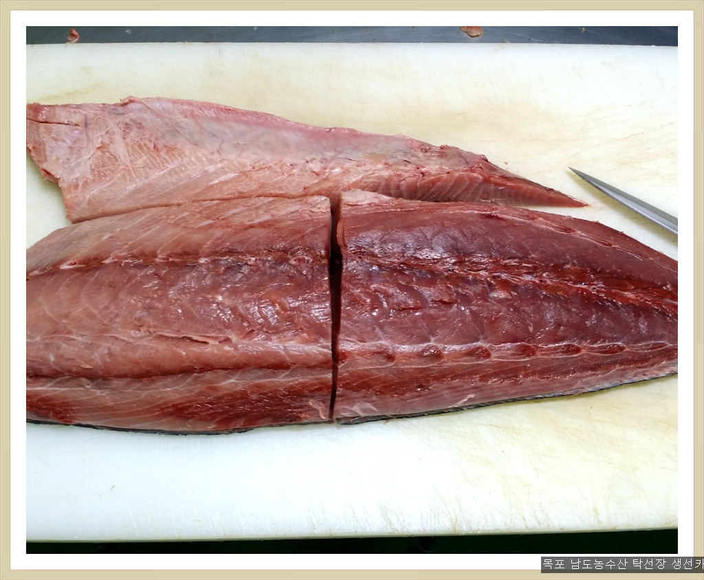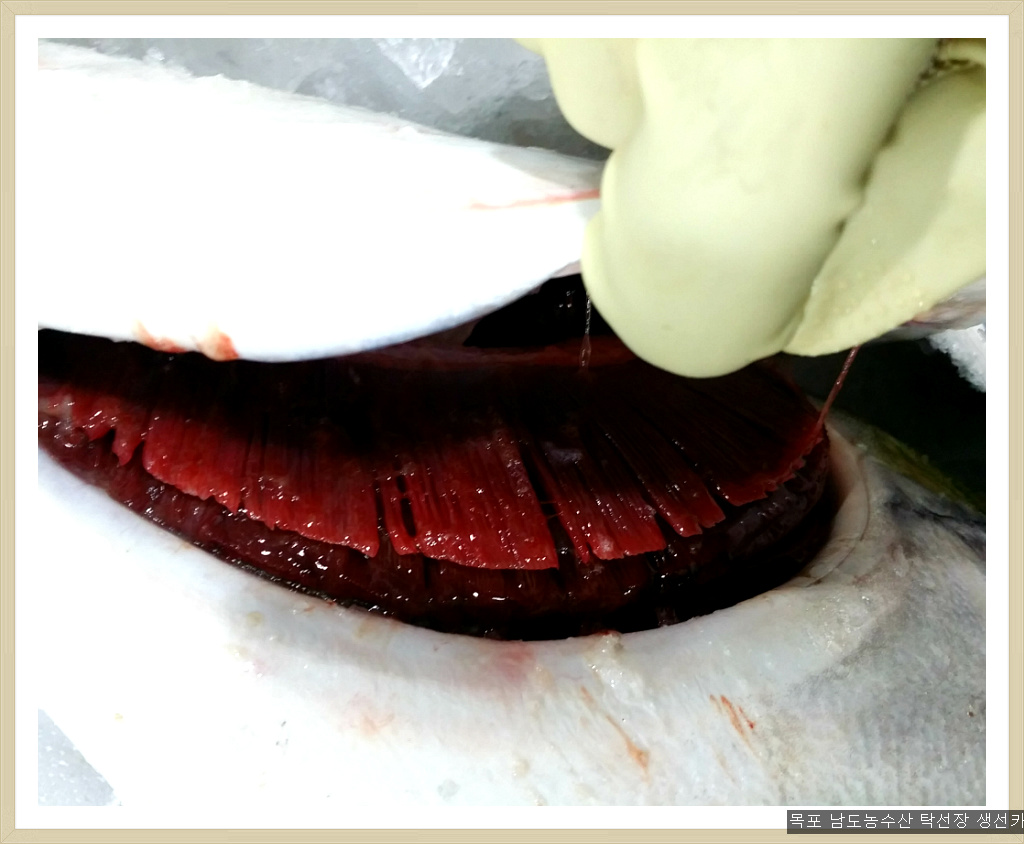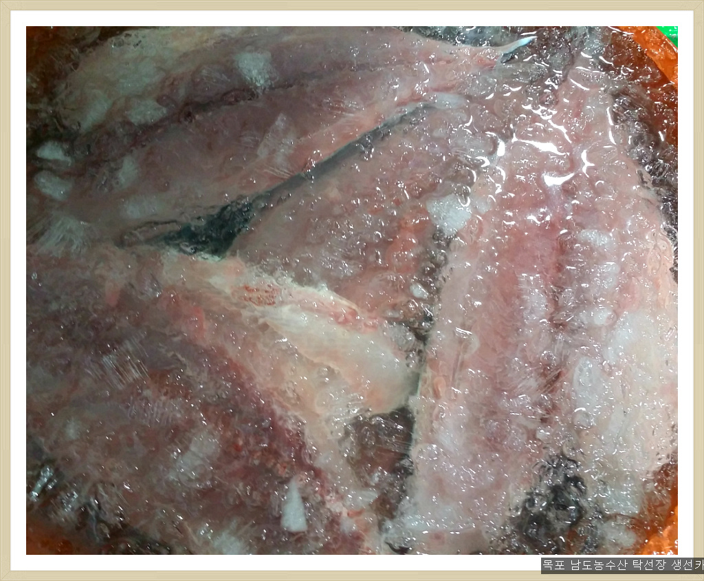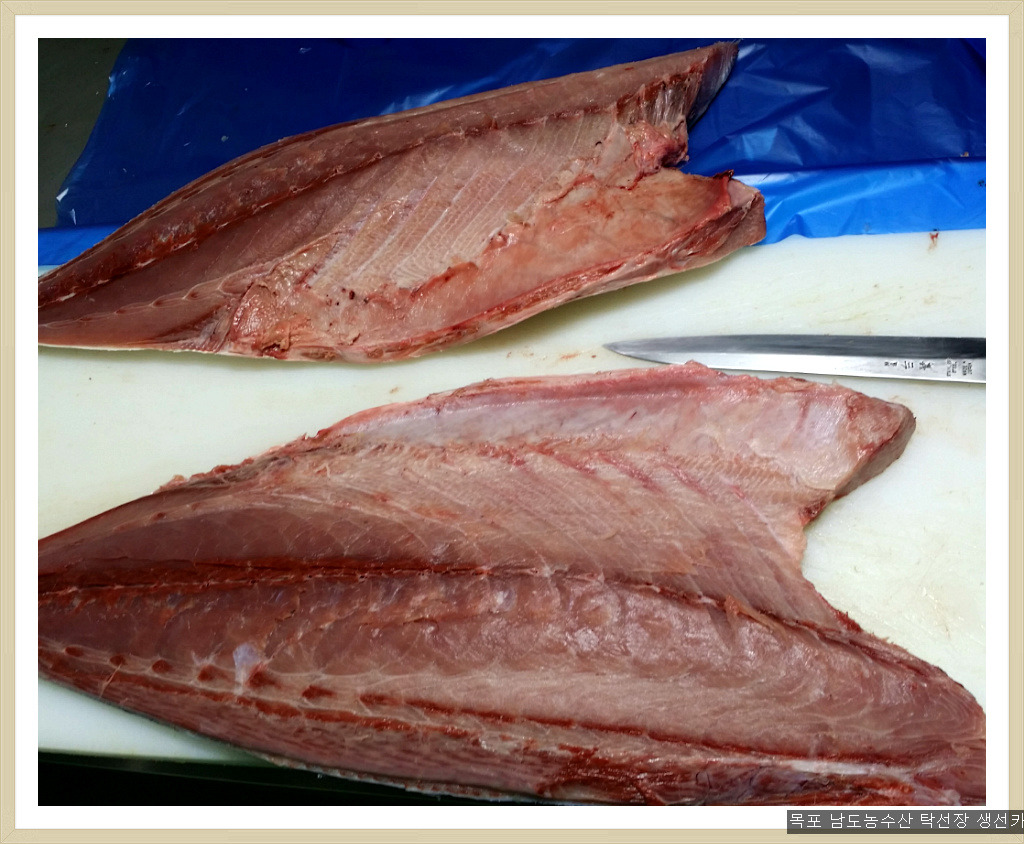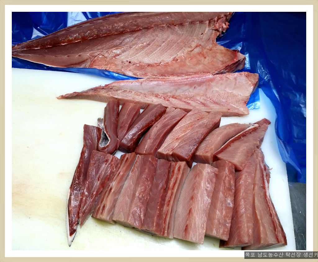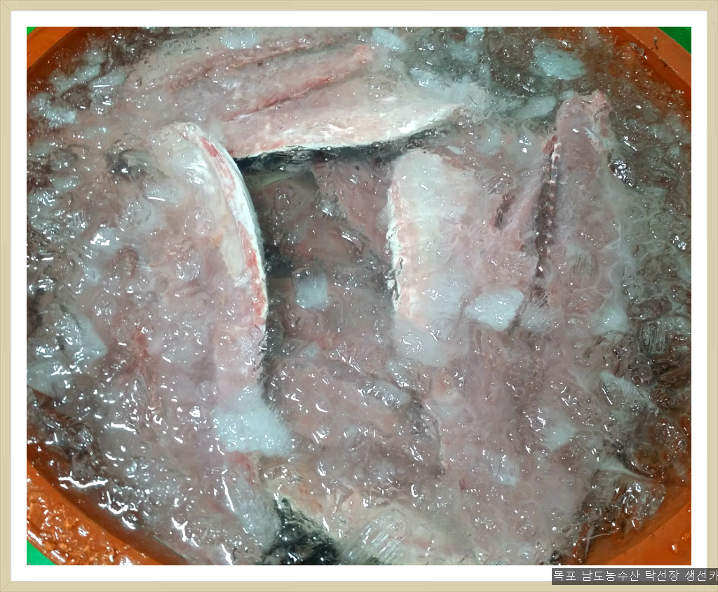 참치전문점 사장님한테 배워서 사진처럼 얼음물에 8분~10분 담궜다 피빼기 및 살을 단단하게 하는 과정을 거치고 세척하여 물기를 닦고 발송하였습니다.