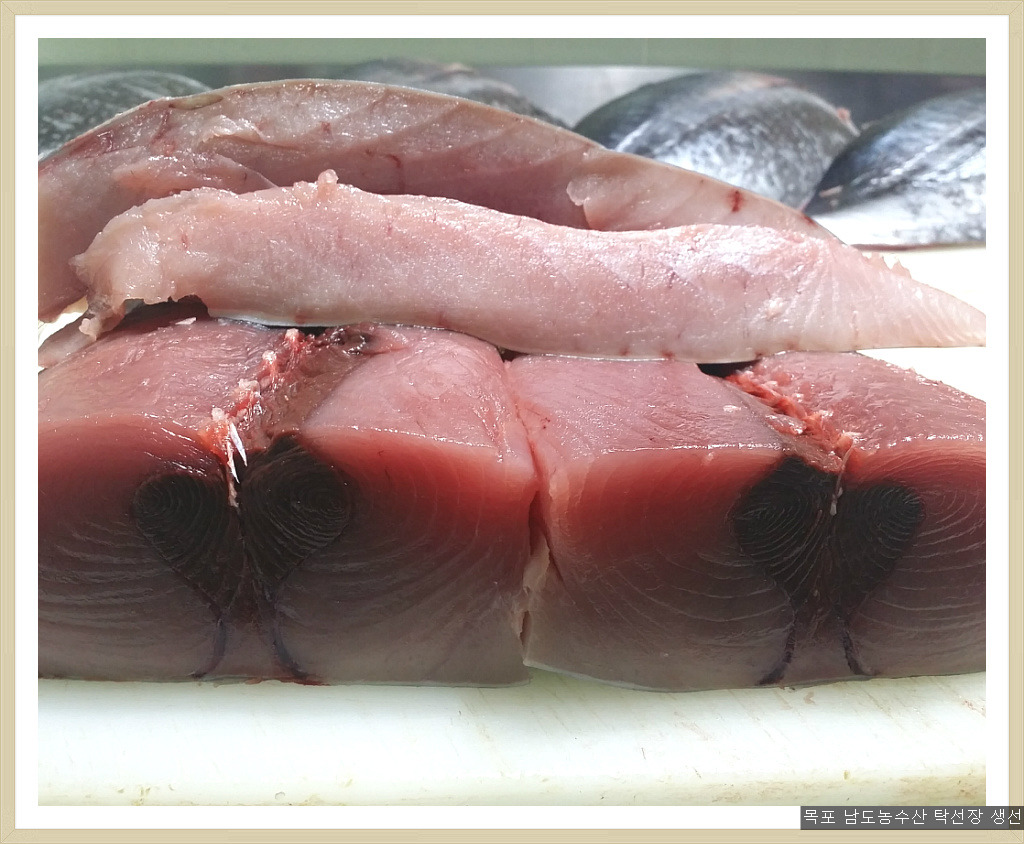 석장뜨기해서 뱃살과 살을 두 토막으로 내서 보내드리며 뼈는 버리고 대가리만 반으로 갈라서 보내드립니다.