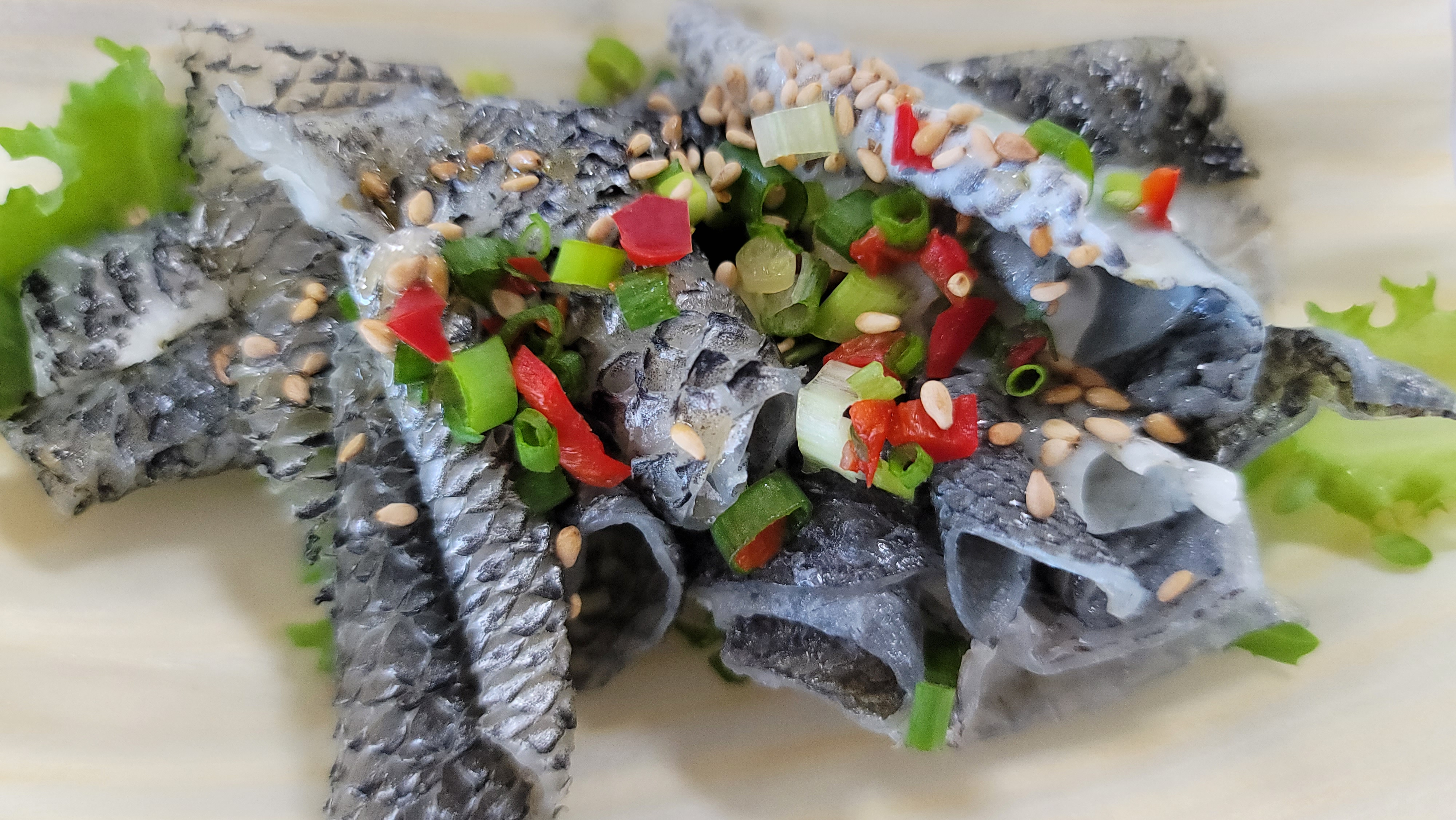 껍질을 끄거운 물에 살짝 데쳐서 찬물에 넣고 물기 제거해서 썰어 드세요.