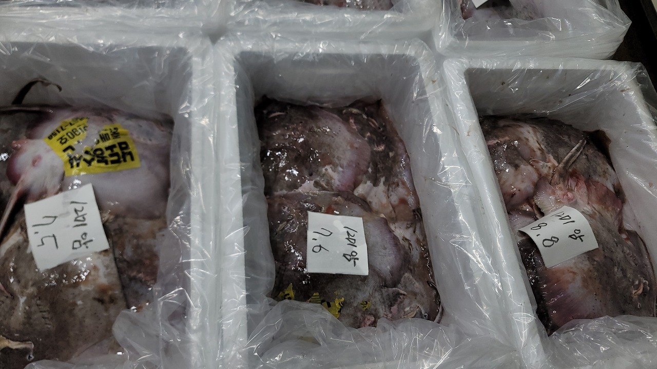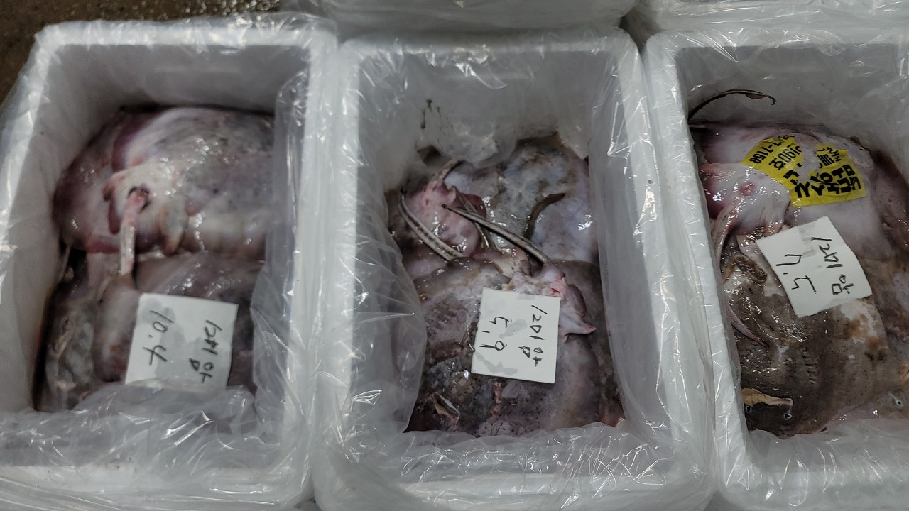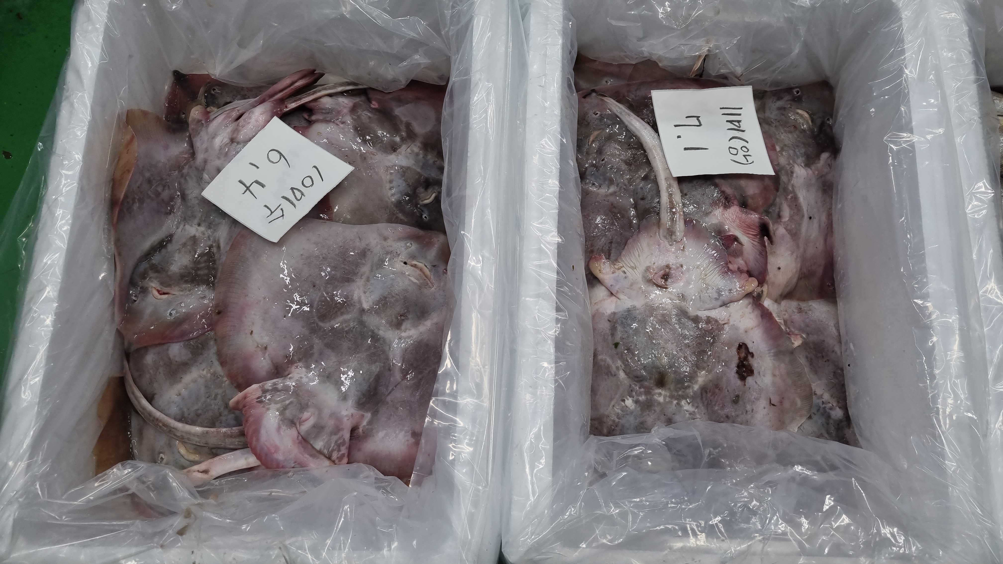 살아있는 상태로 도착하여 무게재고 냉동실에 넣었습니다.