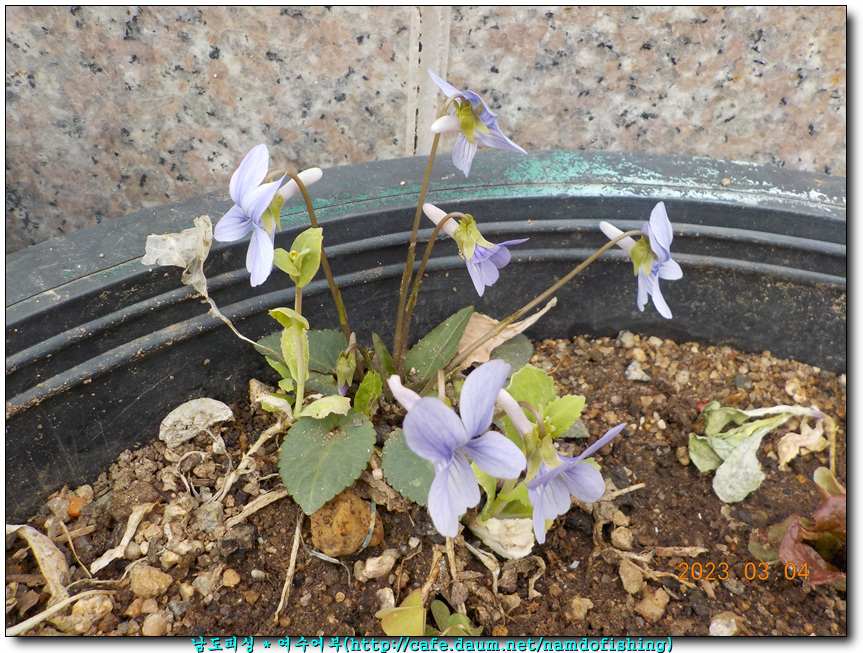 야채 화분에 뿌리 내린 제비꽃입니다.