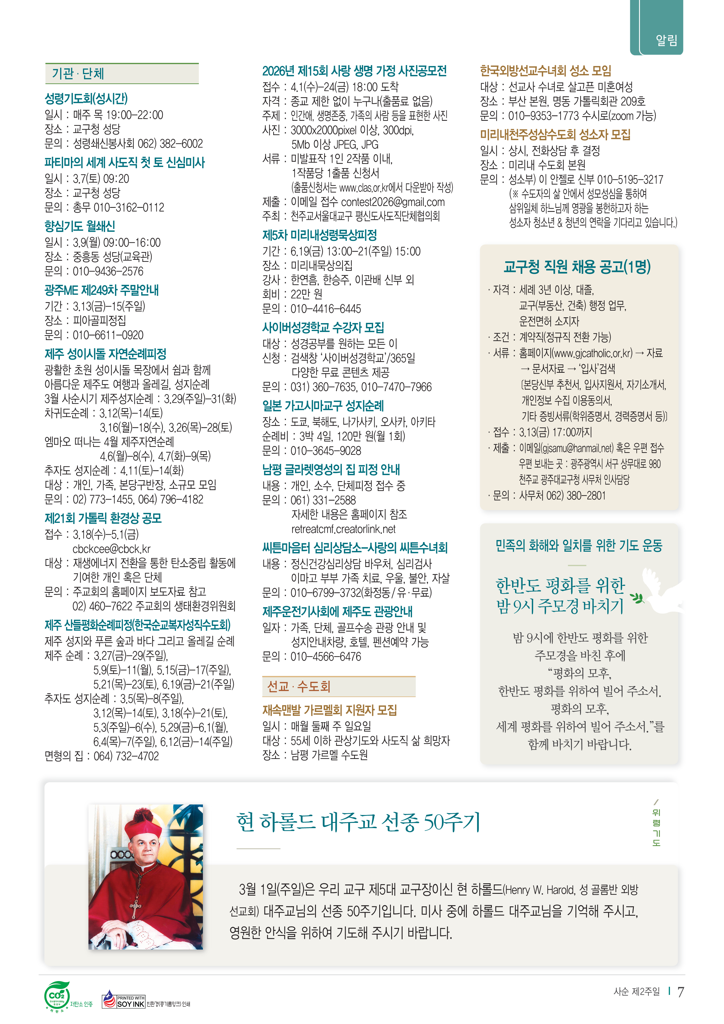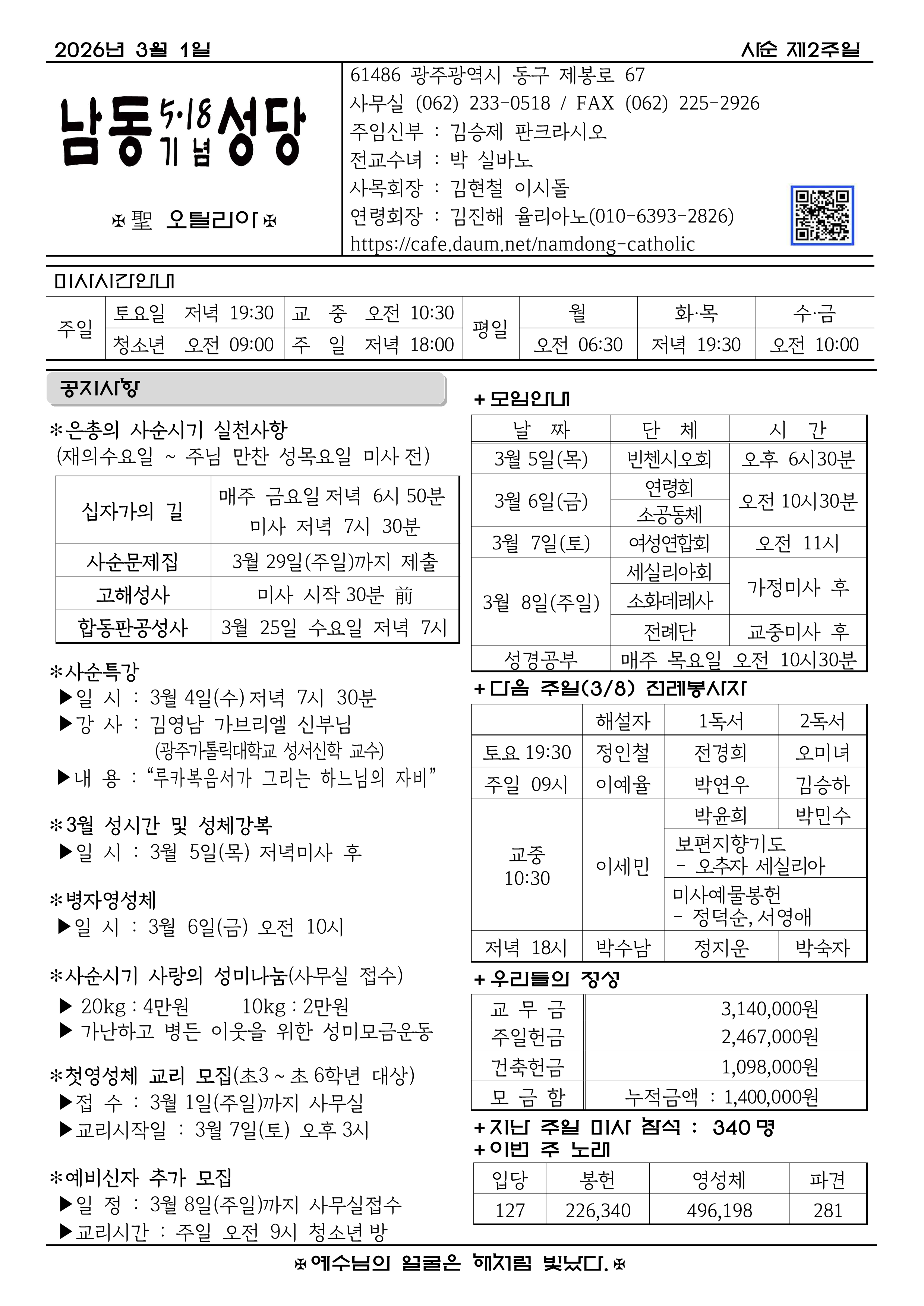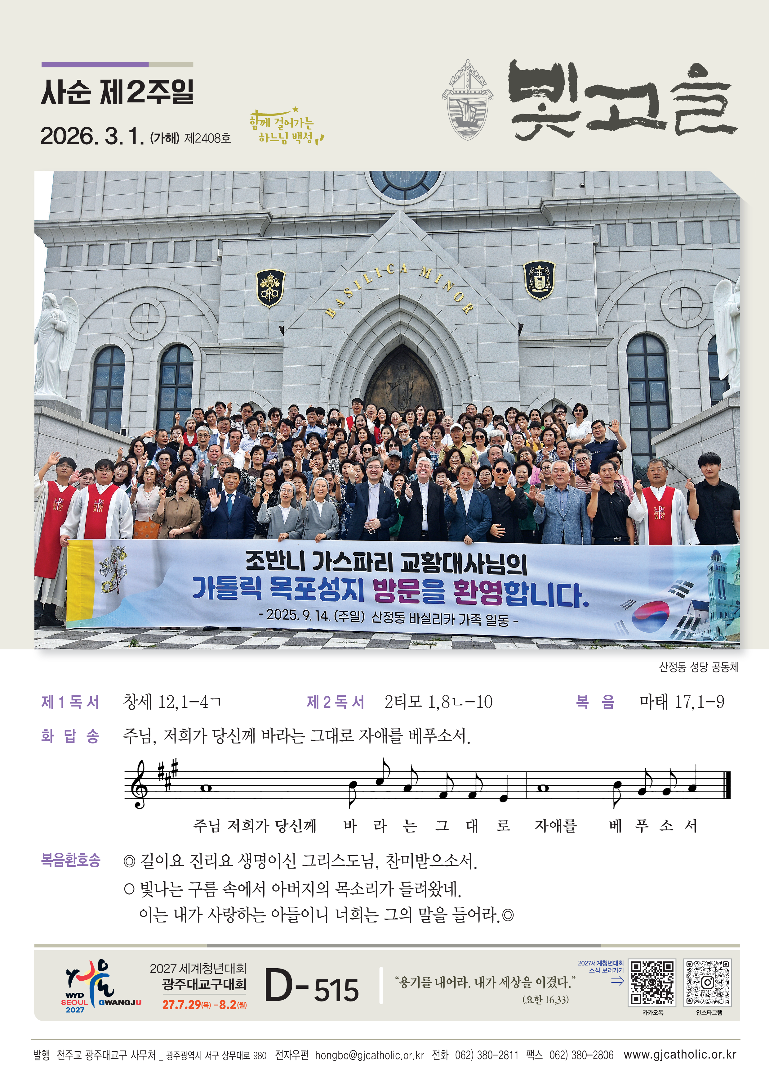 [주보] 2026.03.01(가해) - 사순 제2주일 작성자isidol ~^^|작성시간26.02.27|조회수231 목록 댓글 0 글자크기 작게가 글자크기 크게가 사순 제2주일2026. 3. 1(가해) 다음검색 현재 게시글 추가 기능 열기 북마크 공유하기 신고 센터로 신고 댓글 댓글 0 댓글쓰기 답글쓰기 댓글 리스트