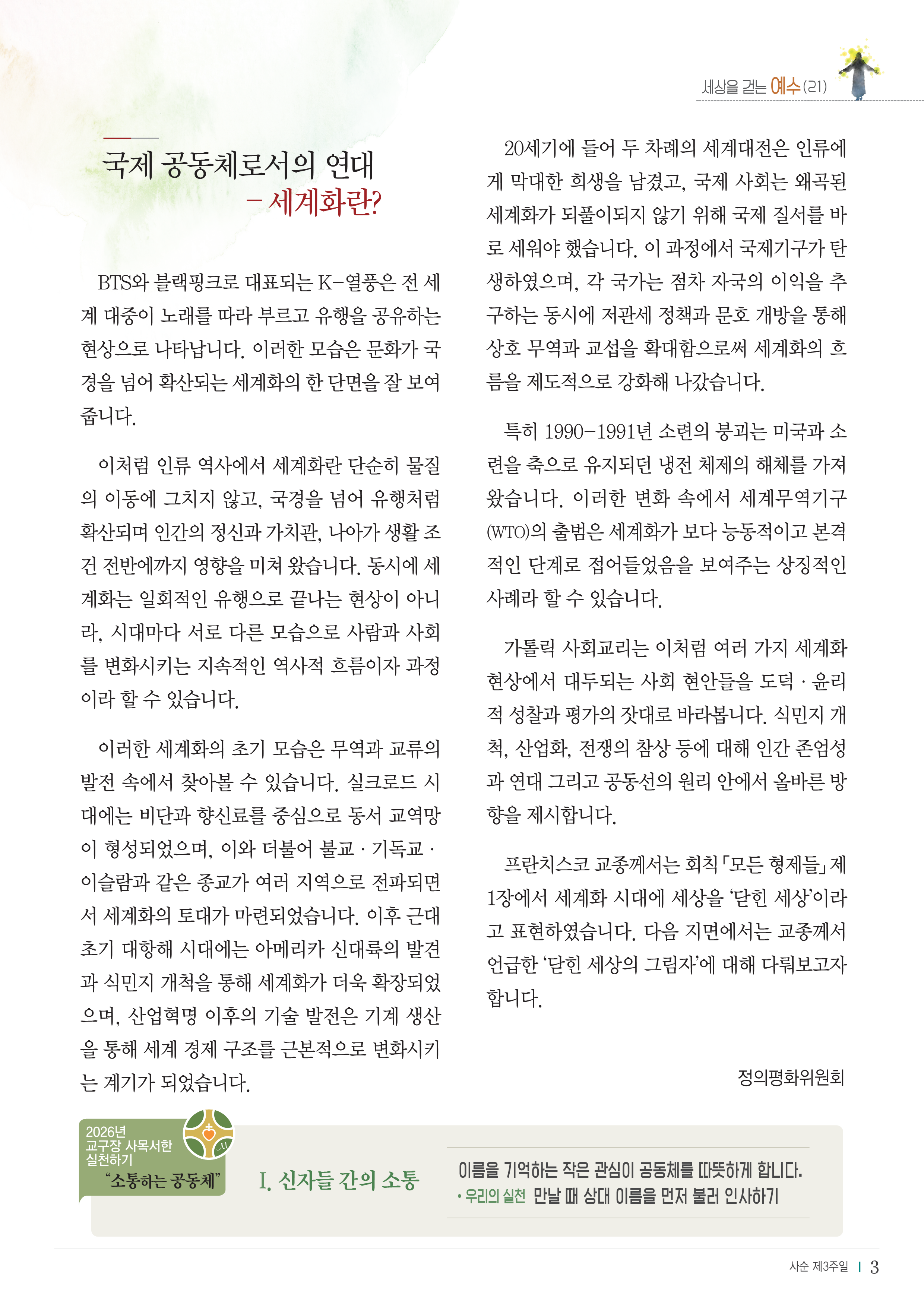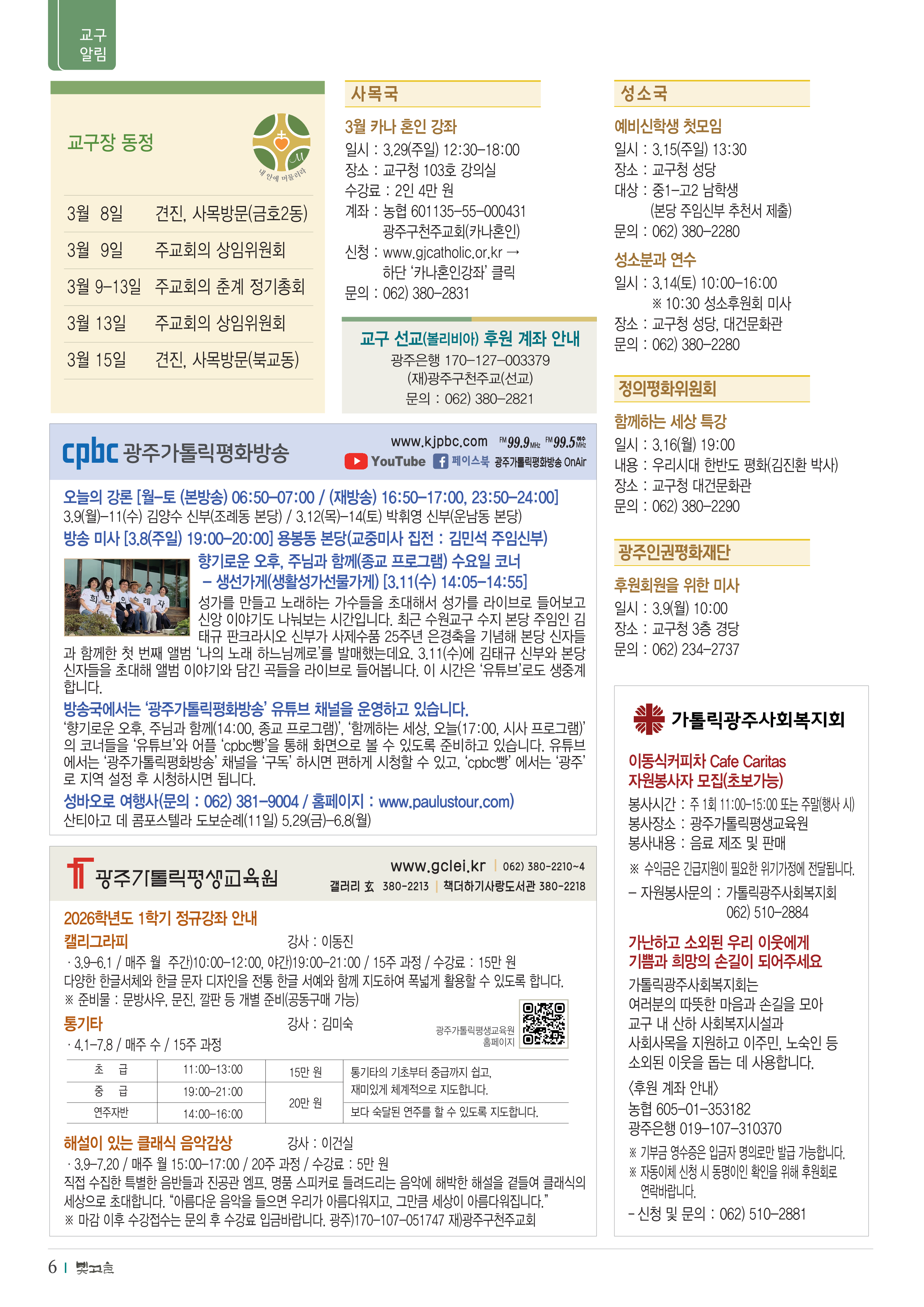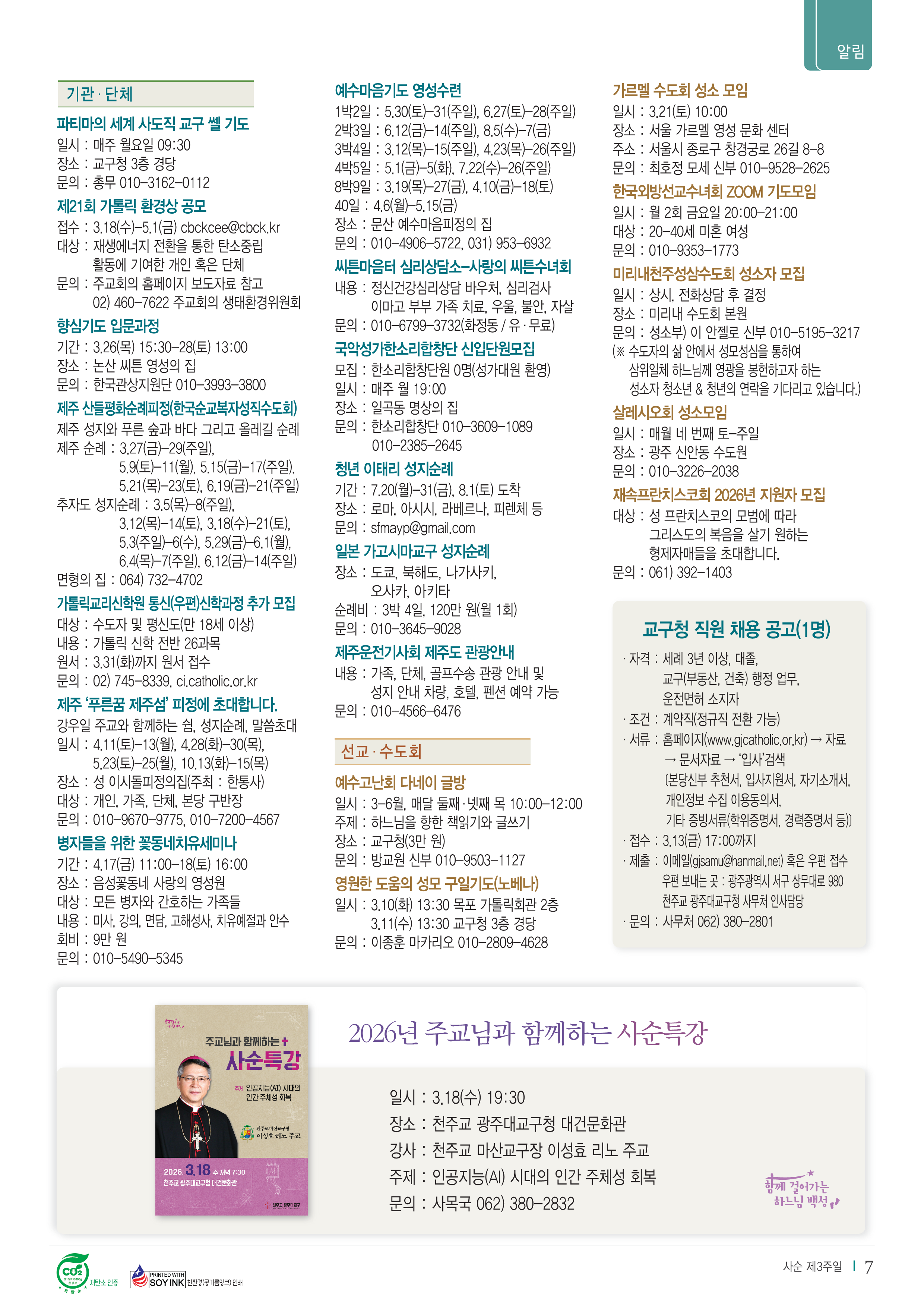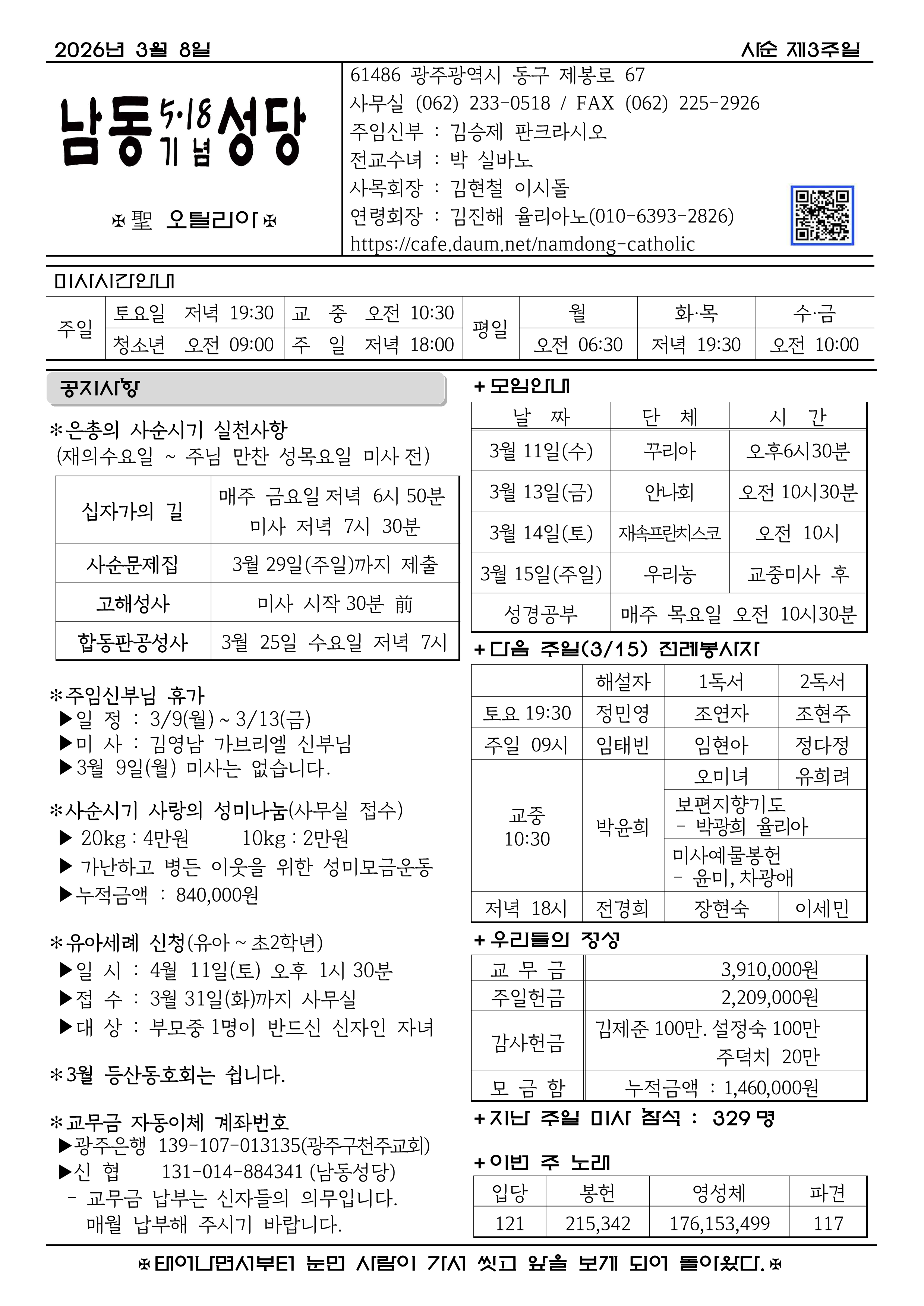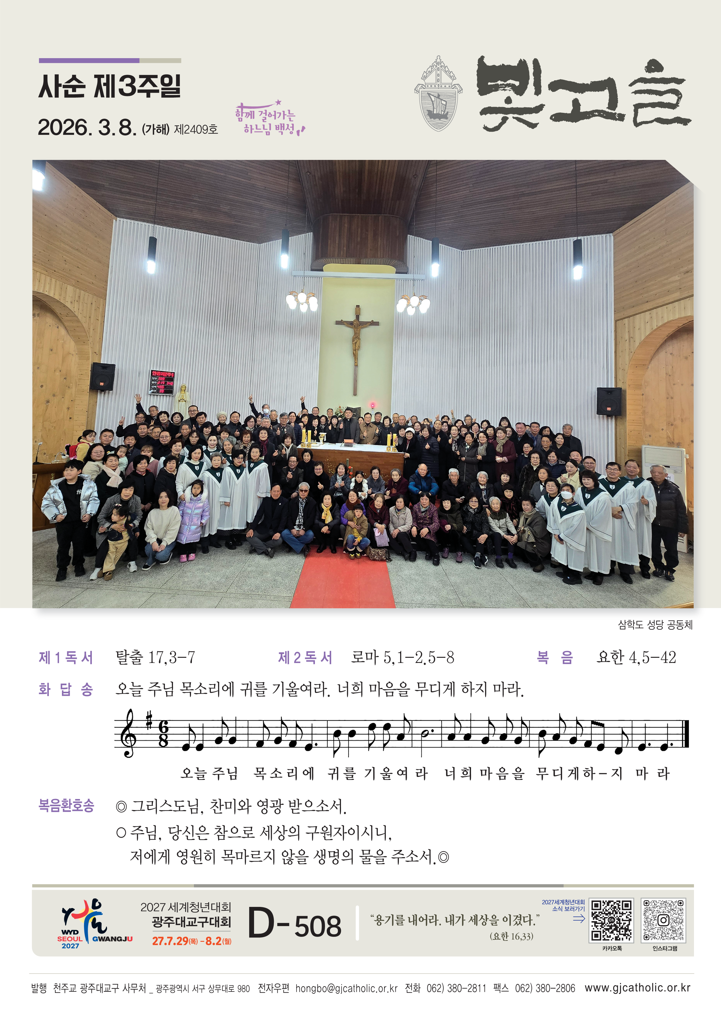 [주보] 2026.03.08(가해) - 사순 제3주일 작성자isidol ~^^|작성시간26.03.07|조회수208 목록 댓글 0 글자크기 작게가 글자크기 크게가 사순 제3주일2026. 3. 8(가해) 다음검색 현재 게시글 추가 기능 열기 북마크 공유하기 신고 센터로 신고 댓글 댓글 0 댓글쓰기 답글쓰기 댓글 리스트