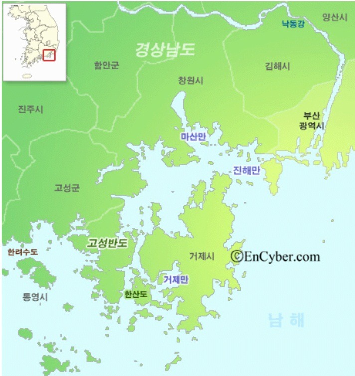 거제도의 북서안과 한반도의 남동부사이에 자리 잡은 비교적 규모가 큰 만이다.