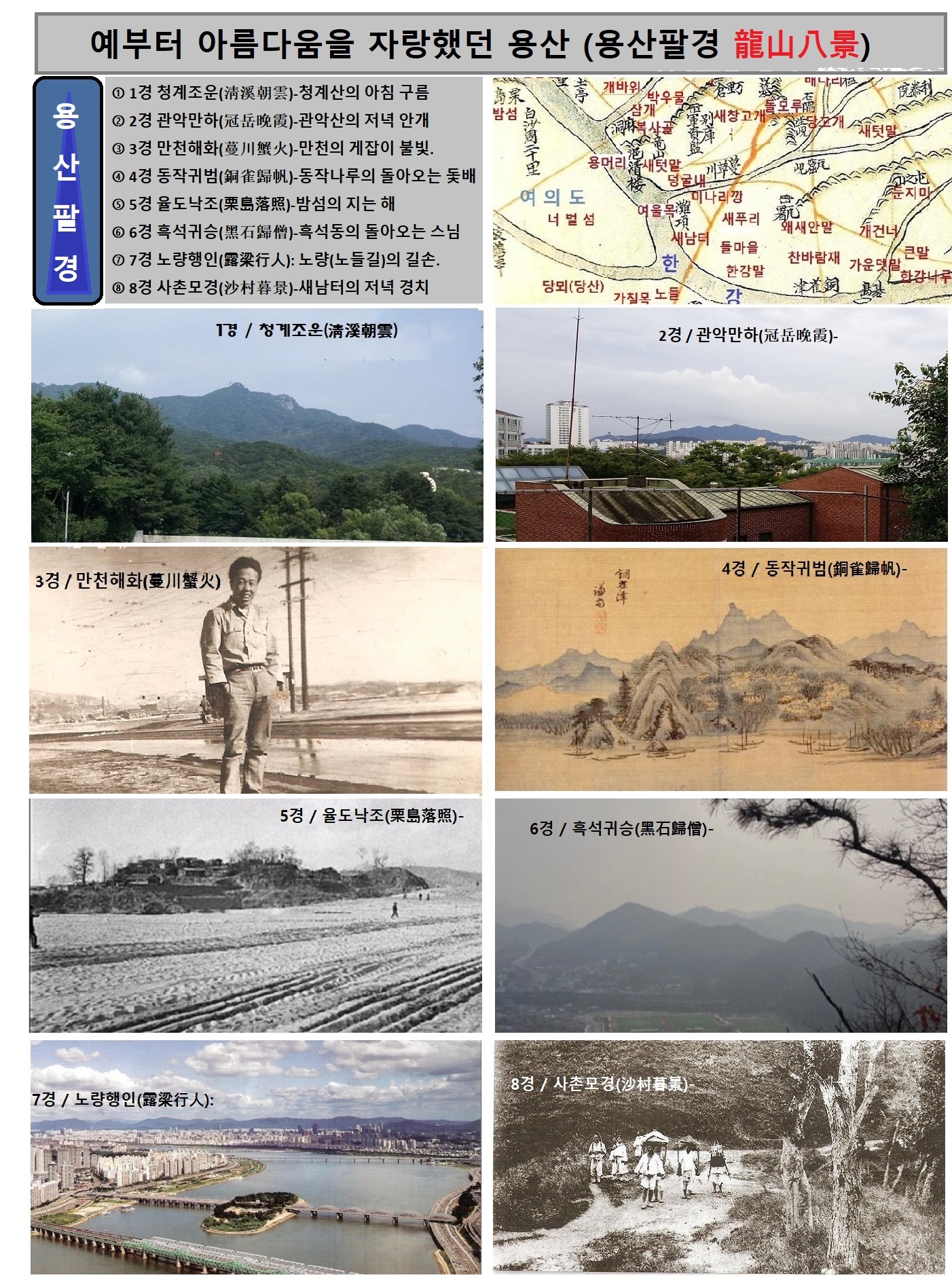 가장 안타까운 것은 용산 산머리에서 볼 수 있었던 그 아름다운 풍경들의 사라짐이다. 용산팔경에서 알 수 있듯이 이 곳에 오르면 주위의 모든 자연 모습이 그림 그 자체였다.