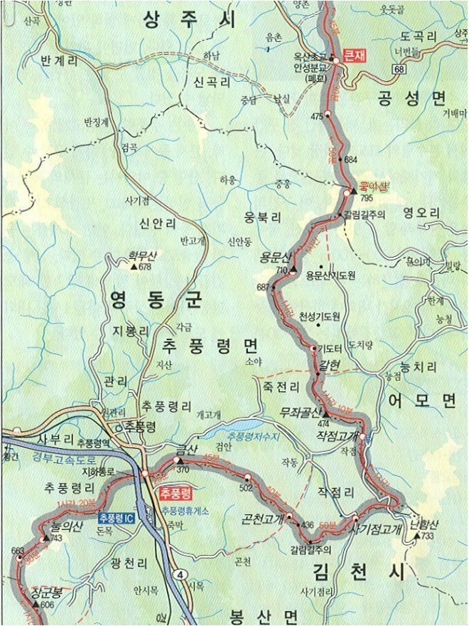 추풍령은 그렇게 높은 고개는 아니지만, 전에는 험준하고 높은 고개였음을 고개 이름의 '령(嶺)'이 잘 말해 주고 있다. ‘령’자가 붙은 고개 이름은 주로 백두대간에 걸쳐 있는데, 대부분 길고 높은 고개이다. 대관령, 진부령, 미시령, 조령, 죽령 등이 모두 백두대간이 고개들이다.