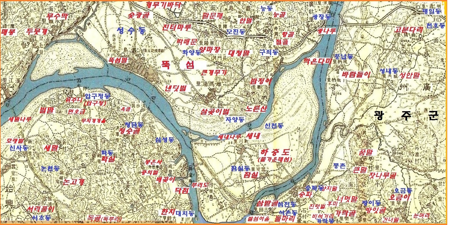 ▲ 한강 남북의 토박이 땅이름, 바탕지도 1916년
