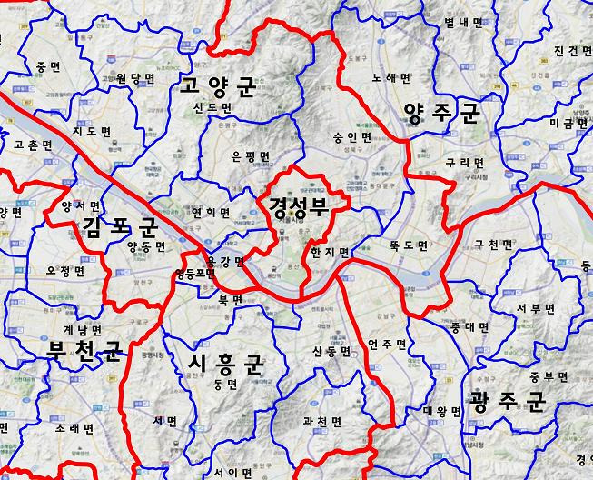 ▲1891년 경성부 시절 고을 경계. 주위는 경기도 광주군 시흥군 고양군 양주군이 둘러쌌다.