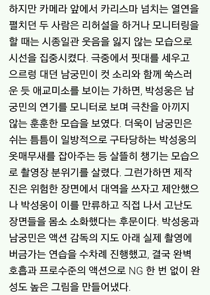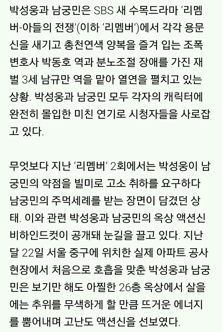 [[신문기사]]'리멤버' 박성웅- 남궁민, 현장에선 '애교 만점' 작성자쮸♡|작성시간15.12.14|조회수233 목록 댓글 3 글자크기 작게가 글자크기 크게가 암요♡천의 배우 우리 민배우님^^엄지척👍 다음검색 현재 게시글 추가 기능 열기 북마크 공유하기 신고 센터로 신고 댓글 댓글 3 댓글쓰기 답글쓰기 댓글 리스트 작성자써니*^^* | 작성시간 15.12.14 역시 연기파 배우님들이세요.그런 장면에 한번에 오케이 촬영하시다니^^ 작성자아브라카다브라 | 작성시간 15.12.15 ng없이 촬영하셨다니 정말 대단하십니다~ 작성자보라마요내즈 | 작성시간 15.12.15 훈훈하다..역시 연기파 배우님들^^ 댓글 전체보기