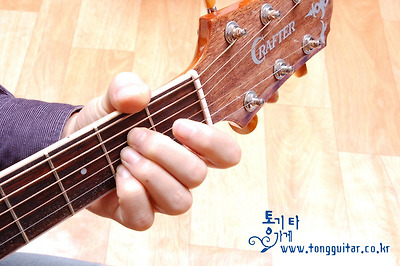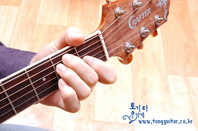 중요한것은 2번째 손가락의 힘이 중요합니다. 6줄 전체를 눌러줘야 하므로 손가락에 힘을 많이 줘야 합니다. 그래서 제 엄지손가락도 튼튼하게 뒤쪽에서 받쳐주고 있죠.