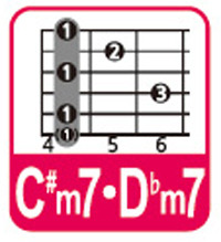 4번 프렛에서 검지로 바레코드를 잡습니다. (6번줄에 괄호가 쳐져있기 때문에 6번줄은 치지 않는게 정석연주입니다.)