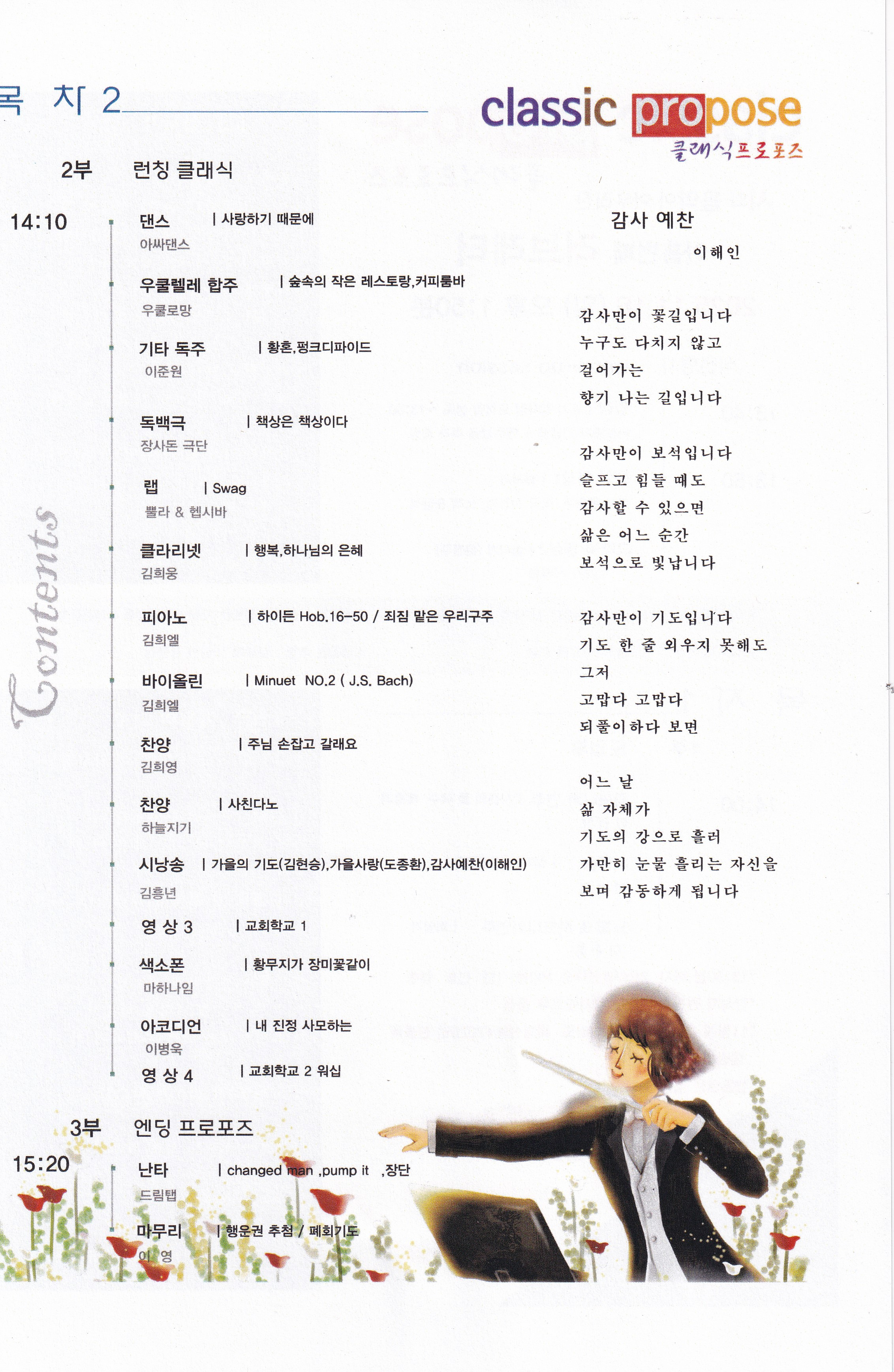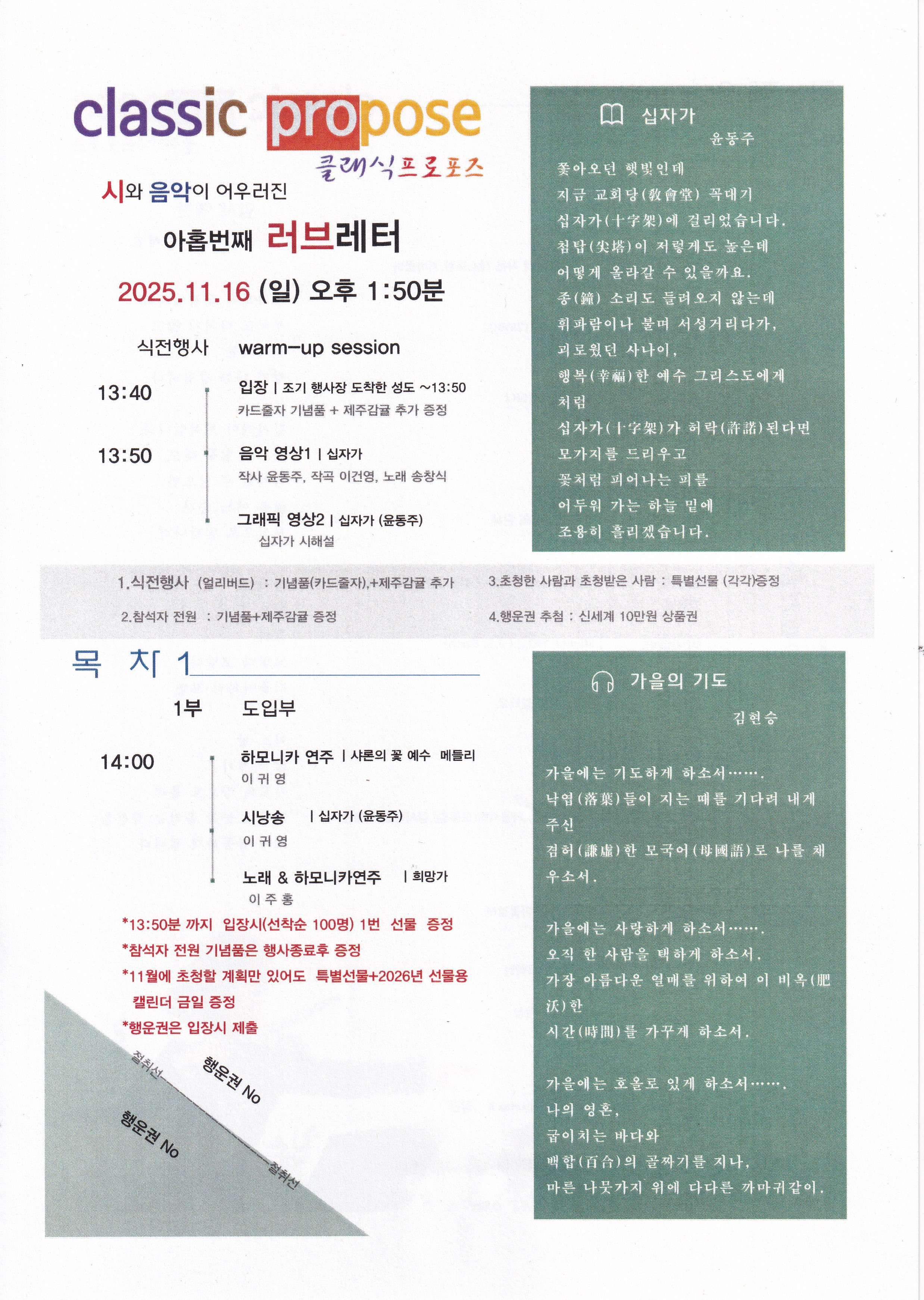 2025.11.16 오후 행사(클래식 프로포즈) 작성자원만해|작성시간25.11.16|조회수24 목록 댓글 0 글자크기 작게가 글자크기 크게가 다음검색 현재 게시글 추가 기능 열기 북마크 공유하기 신고 센터로 신고 댓글 댓글 0 댓글쓰기 답글쓰기 댓글 리스트