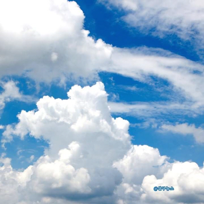 솟아오르고 또 그 위 파란 하늘에 뭉게구름 내려와