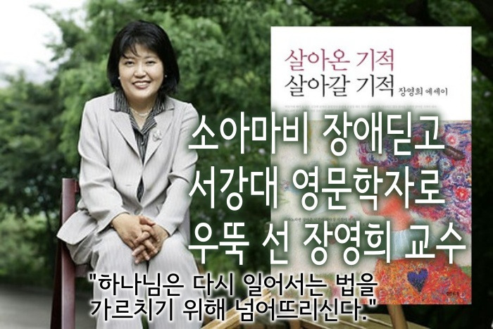 56세에 별세한 고 장영희 서강대교수 (1952년~2009년)는 생후 1년 만에 1급 소아마비로 살아오면서 평생 세 번의 암과 투쟁하면서도 사람들에게 희망을 전하는 글을 남겼다. 내가 살아보니까 ~~ 사람들은 남의 삶에 그다지 관심이 많지 않다. 그래서 남을 쳐다볼 때는 부러워서든, 불쌍해서든 그저 호기심이나 구경 차원을 넘지 않더라. 내가 살아보니까 ~~ 정말이지 명품 핸드백을 들고 다니든, 비닐봉지를 들고 다니든 중요한 것은 그 내용물이더라. 내가 살아보니까 ~~ 남들의 가치 기준에 따라 내 목표를 세우는 것이 얼마나 어리석고, 나를 남과 비교하는 것이 얼마나 시간 낭비고, 그렇게 함으로써 내 가치를 깎아 내리는 바보 같은 짓인 줄 알겠더라. 내가 살아보니까 ~~ 결국 중요한 것은 껍데기가 아니고 알맹이더라. 겉모습이 아니라 마음이더라. 예쁘고 잘 생긴 사람은 TV에서 보거나 거리에서 구경하면 되고 내 실속 차리는 것이 더 중요하더라. 재미있게 공부해서 실력 쌓고, 진지하게 놀아서 경험 쌓고, 진정으로 남을 대해 덕을 쌓는 것이 결국 내 실속이더라. 내가 살아보니까 ~~ 내가 주는 친절과 사랑은 밑지는 적이 없더라. 소중한 사람을 만나는 것은 한 시간이 걸리고, 그를 사랑하게 되는 것은 하루가 걸리지만 그를 잊어버리는 것은 일생이 걸린다는 말이더라. 내가 살아보니까 ~~ 남의 마음속에 좋은 추억으로 남는 것만큼 보장된 투자는 없더라. 우리 나이면 왠 만큼은 살아본 거지? 이제 우리 나이면 무엇이 소중하고 무엇이 허망함인지 구분할 줄 아는 나이 진실로 소중한 게 무엇인지 마음 깊이 깨달아 지는 나이 남은 시간 동안 서로서로 보듬어 안아주고 마음 깊이 위로하며 공감하고 더불어 같이 지낼 수 있는 친구의 소중함을 깨우쳐 알아지는 나이 장영희 교수(張英姬, 1952~2009 56세 별세) 어머니의 정성과 사랑 첫돌을 앞둔 어느 날, 아기는 40도가 넘는 고열에 시달리고 있었다. 아기는 눈만 깜빡이며 울지도 못했다. 엄마는 아기를 안아 달랬다. 그때 아버지가 갑자기 “아, 소아마비!”라고 외마디 소리를 질렀다. 그 아기는 두 발을 모두 쓸 수 없는 1급 소아마비가 되었다. 엄마는 아기를 업고 10년 동안 매일 침술원을 다녔다. 그 아기가 장영희(張英姬, 1952~2009)이다. 엄마는 딸이 초등 3학년까지 업어서 학교로 데려다 주었다. 등교할 때 눈이나 비가 오면 ‘목숨을 걸고’ 가야 했다. 엄마는 눈이 오면 눈 위에 연탄재를 깔았고, 비가 오면 한 손으로는 딸을 받쳐 업고 다른 손으로는 우산을 들었다. 겨울이면 딸의 다리 혈액 순환이 잘되라고 두툼한 솜이 들어간 바지를 아랫목에 넣어 따뜻하게 데워 입혔다. 세수와 아침 식사 그리고 보조기를 신는 일까지 모두 엄마가 도와주었다. 딸이 등교했어도 엄마는 딸을 화장실에 데려가기 위해 두 시간마다 학교에 왔다. 아버지 장왕록 교수와 어린 장영희 번번이 거절당해도 굴하지 않은 아버지 아버지는 장애인 딸이 살아갈 수 있는 길은 오직 남들처럼 똑같은 교육을 받는 것뿐이라고 생각했다. 그래서 재활학교가 아니라 일반 학교에 보내려고 필사적으로 노력했다. 그런데 일반 학교에서는 신체적 장애를 이유로 입학을 거부했다. 초등학교를 졸업하고 중학교에 지원할 때도 입학시험을 허락하지 않았다. 아버지는 중학교를 찾아 다니며 시험만이라도 보게 해달라고 간청했다. 번번이 거절당했다. 아버지가 서울사대 교수였기에 서울사대 부속 중학교 교장의 배려로 시험을 볼 수 있었다. 그런데 체력장은 면제해 줄 수 없다고 했다. 그러면 학과 시험에서 한 문제도 틀리면 안 되었다. 장영희는 잠자지도 먹지도 않고 공부만 했다. 그 결과, 중학교 입학시험에 ‘기적같이’ 합격했다. 대학들도 장애인에 대해서는 철벽이었다. 아버지는 서강대 영문학과장인 미국인 신부를 찾아갔다. 입학시험 이야기를 했더니 “시험을 머리로 보는 것이지 다리로 보나요?”라며 “장애인이라고 해서 시험 보지 말라는 법이 어디 있습니까?”라고 되물었다. 이렇게 해서 장영희는 서강대 영문학과에 입학했다. 아버지 장왕록 교수는 60여 권의 영미문학 번역서를 냈다. 「그리스 로마 신화」, 「대지」, 「인간의 굴레」, 「달과 6펜스」, 「바람과 함께 사라지다」와 같은 명작들을 한국에 소개했다. 학생 시절의 장영희 슬픈 소망을 품고 초등학교 때 장영희네 집은 서울 제기동의 작은 한옥이었다. 그곳은 골목이 많아 아이들이 즐겁게 뛰놀았다. 엄마는 딸이 집에서 책만 읽는 것이 싫었다. 그래서 골목에 아이들이 모일 시간이면 대문 앞에 방석을 깔고 딸을 앉혔다. 아이들은 술래잡기, 사방치기, 공기놀이, 고무줄놀이를 했다. 장영희가 할 수 있는 것은 공기놀이밖에는 없었다. 친구들은 기특하게도 장영희를 배려했다. 심판을 보게 하거나 책가방과 신발주머니를 맡으라고 역할을 주었다. 바로 그 골목에서 ‘잊을 수 없는 사람’을 만났다. 장영희가 집 앞에 혼자 앉아있었다. 그때 엿장수가 가위 소리를 내며 지나가고 있었다. 엿장수는 목발을 옆에 세워놓고 앉아있는 장영희를 보더니 그냥 지나갔다. 그런데 리어카를 멈추고 장영희에게 다가왔다. 엿장수는 미소를 지
