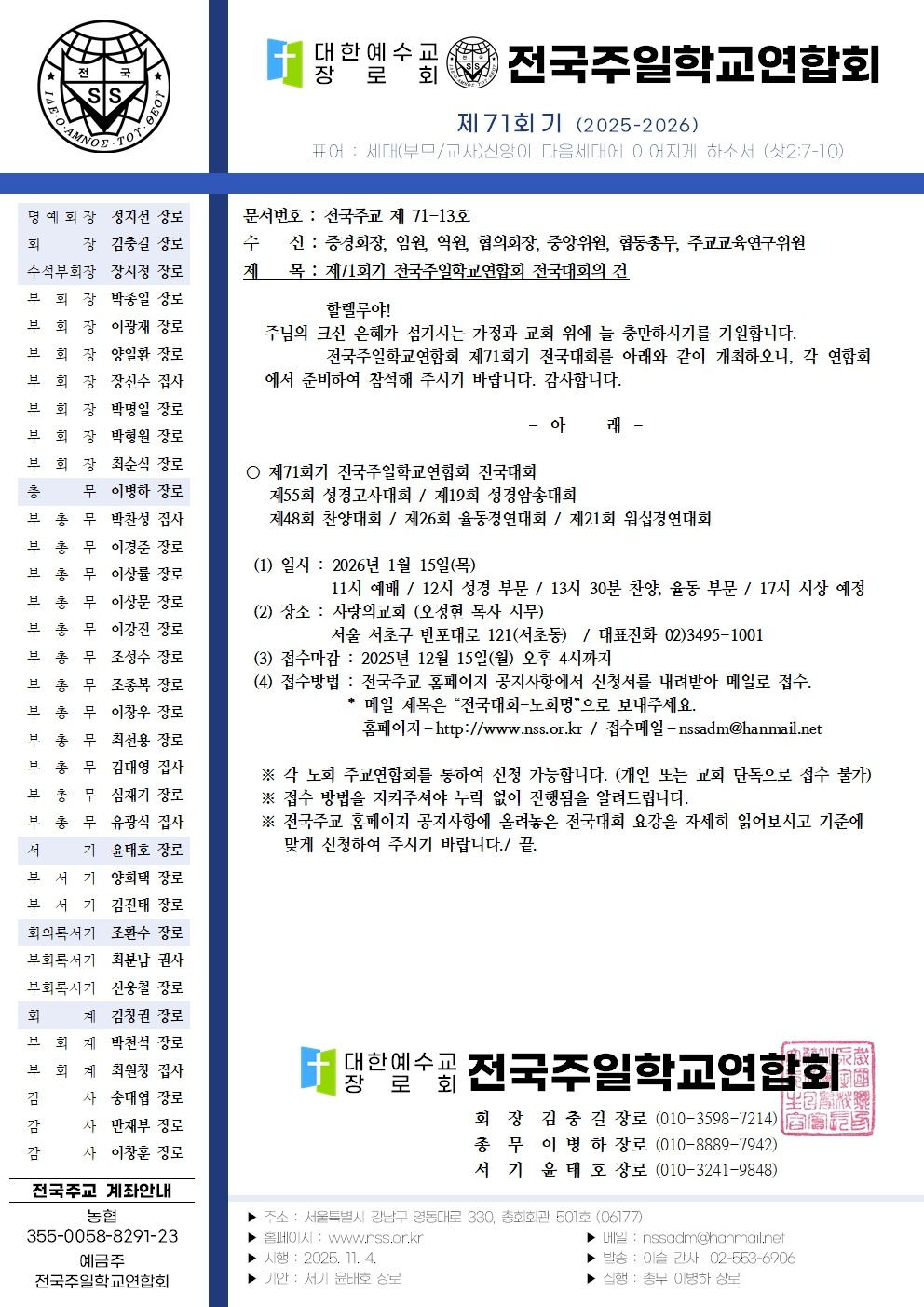 아래와 같이 제71회기 2026년 전국대회가 진행됩니다.