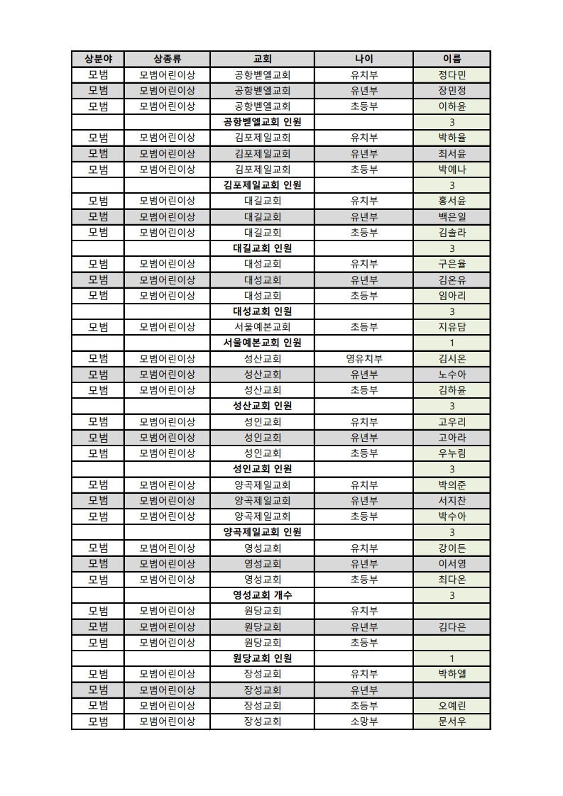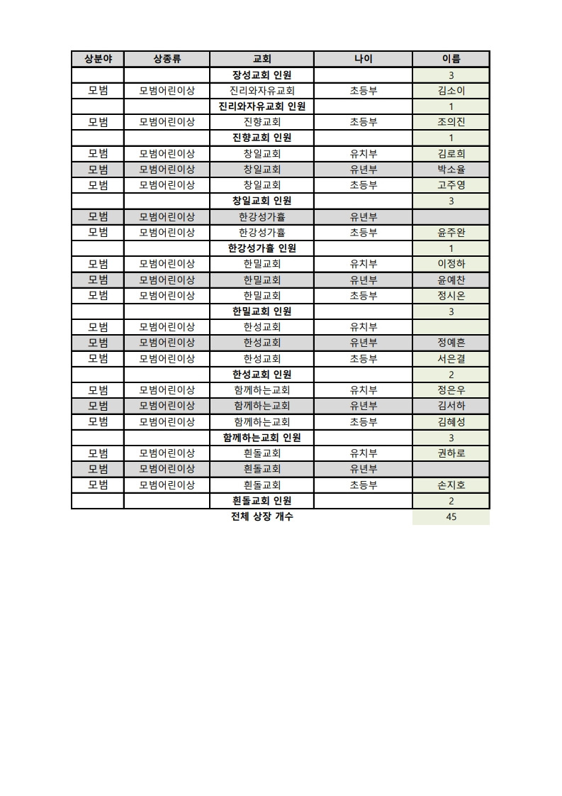 각 교회별 모범어린이 명단입니다. 총 45명입니다.