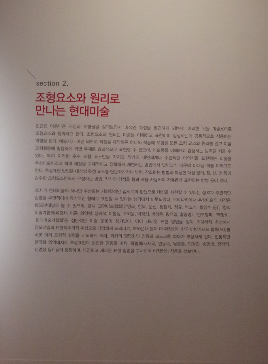 우리나라 추상 회화의 선두주자인 김환기와 유영국의 작품을 비롯하여 이응노의 문자추상과 하인두, 이우환 등으로 이어지는 점, 선, 면의 추상화들이 다채롭게 전시되고 있습니다.
