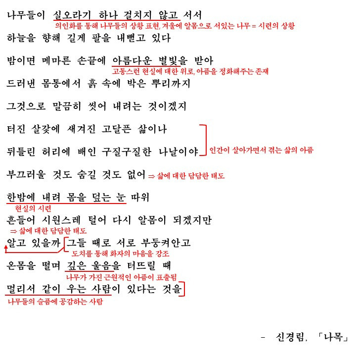 이 '나목'을 통해 시인이 어떤 의미를 전달하고 있는지를 생각하며 시를 감상한 후 해석을 통해 학습해보도록 합시다.