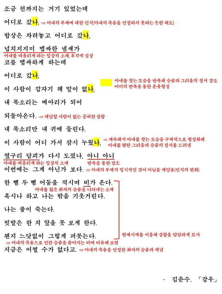 (인식의 변화) 그리고 비가 오는데요. 화자는 혹시나하고 밖을 기웃거리지만 역시나 아내는 보이지 않고 풀이 죽습니다.