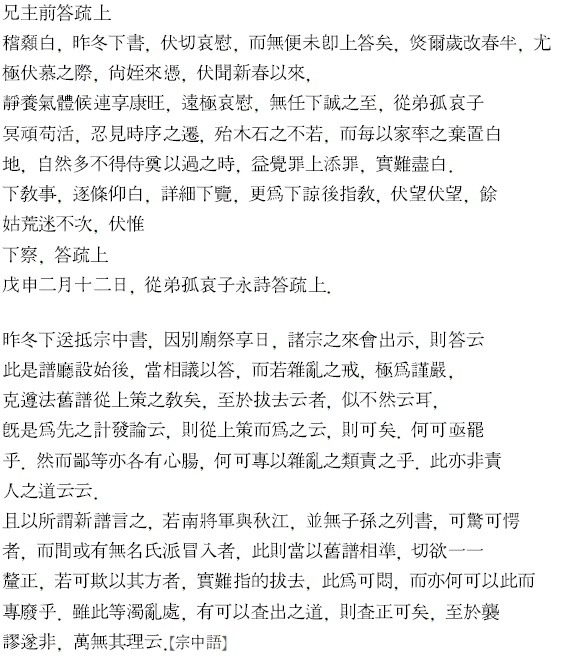 지난 겨울에 내려보내주신 종중에 보내는 편지는 별묘(別廟)에 제향하는 날 종인들이 아서 모였을 때 꺼내 보였더니, “이것은 보청(譜廳)을 설치한 뒤에 상의하여 답하겠습니다. 잡스러워지고 어지러워지는 것을 경계한 말씀이 지극히 근엄하니, 옛 족보를 따르는 것이 상책이라는 말씀을 따르겠습니다. 그러나 빼내라는 말씀은 옳지 않은 듯합니다. 이미 조상을 위하는 생각으로 논의를 꺼냈으니, 상책을 따라야 한다는 말씀은 옳습니다. 어찌 서둘러 그만둘 수 있겠습니까. 그러나 저희들도 각기 심장이 있는데, 어찌 잡스럽고 어지러운 부류라고만 책망하십니까. 이것은 사람을 책망하는 도리가 아닙니다. ”라고 하였습니다.