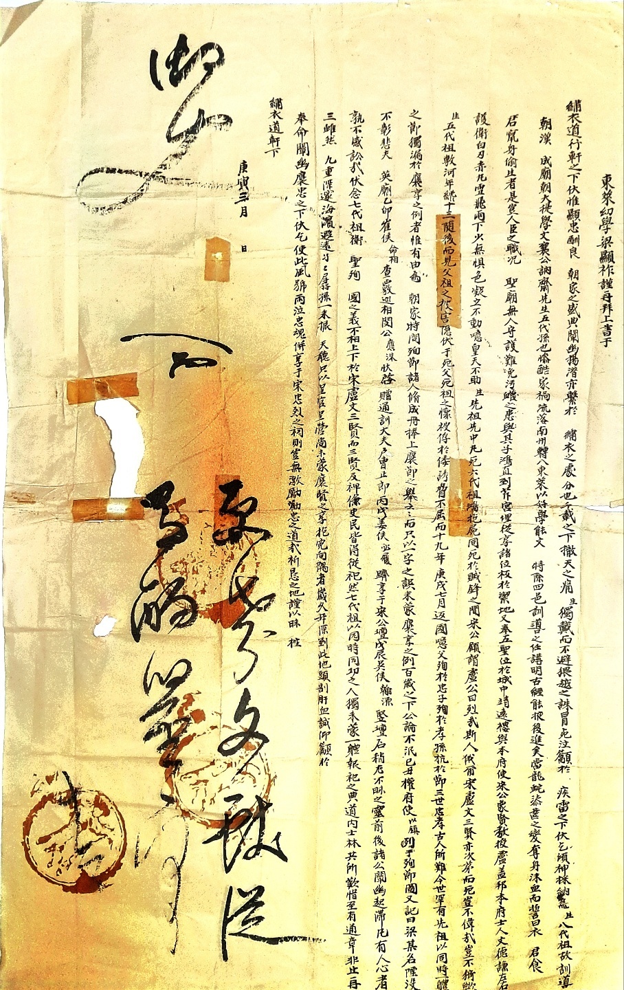 東萊幼學梁顯祚謹再拜上書于 □ 梁顯祚(양현조 27세)는 平昌公(평창공) 希曾(희증)의 11代孫(대손) 동래 유학 梁顯祚(양현조)는 재배하옵고 삼가 수의사또(어사)전에 글을 올립니다. 생각하옵건대 忠良(충량)을 顯酬(현수)함은 나라의 典範(전범)이요. 숨은 공적을 밝혀 들어냄은 어사또의 직분이라 봅니다. 千年(천년)이 지났어도 철천지 통한으로 小生(소생)은 홀로 외람되게도 죽음을 무릅쓰고 어사또에게 울부짖어 아뢰오니 굽어 살피시고 採納(채납)해 주시기 바랍니다. 小生(소생)의 8代祖(대조) 故(고)訓導(훈도) 梁朝漢(양조한)은 成宗(성종)때, 大堤學(대제학) 文襄公(문양공) 訥齋先生(눌재선생)의 6代孫(대손)으로, 참혹한 家禍(가화)를 입어 南道(남도)로 流落(유락)하다가 東萊(동래)에 轉入(전입)하여. 好學能文(호학능문)으로 네 고을의 訓導職(훈도직)을 제수받아 古經(고경)을 講明(강명)하고 後進(후진)을 養成(양성)했습니다. 壬辰(임진)癸巳(계사)의 倭亂(왜란)을 당하여 몸을 일으켜 피를 뿜어 맹세하여 말하기를 “임금의 은혜로 밥을 먹고 옷을 입으면서(이런 위급한 때에) 몸을 숨겨 살기만을 꾀하는 것이 어찌 신하된자의 도리이겠는가, 하물며 文廟(문묘)(공자 이하 여러 선현을 모신 향교사당)를 지킬 사람이 없어 聖域(성역)을 더럽힐 위급한 지경임에랴”하고 그 아들 鴻(홍)과 芹宮(근궁)으로 바로 달러가 從享(종향)된 여러 先賢(선현)의 位牌(위패)를 정결한 땅에 묻고 또 五聖(오성)(공자, 맹자, 증자. 안자, 자사)의 위패를 域中(성중) 靖遠樓(정원루) 에 받들어 모시고. 동래부사 宋象賢(송상현)과 교수 盧蓋邦(노개방)과 동래선비 文德謙(문덕겸)과 함께 左右(좌우)로 호위하여 눈비같이 쏟아지는 탄환과 칼날에도 조금도 두려움없이 꿋꿋이 서 버티다가 아아 하느님도 무심하게, 小生(소생)의 선조께서 먼저 적의 탄환에 맞아 돌아가시자 7대조 鴻(홍)께서는 그 시신을 안고 적의 창끝에 돌아가셨습니다. 이때 宋公(송공)께서 盧公(문공)을 돌아 보시고, "참으로 壯烈(장렬)하도다. 이 사람이여! 하시고 이어 또 그 宋·盧·文(송.노.문) 三賢(삼공)이 차례로 돌아가셨으니 아아 이 얼마나 거룩하고 위대하신 일입니까? 小生(소생)의 6代祖(대조) 梁敷河(양부하)는 나이 겨우 13세로 뒤따르다가 父祖(부조)가 모두 被害(피해)됨을 보고, 돌아가신 할아버지 아버지의 품에 숨어 엎드렸다가 왜놈에게 붙들려 포로가 되어 잡혀가서 갖은 위협에도 굽히지 않고 19년 후인 庚戌年(경술년) 7월에 귀국하였습니다. 아아. 아비는 忠(충)을 위해 殉死(순사)하시고. 아들은 孝(효)를 위해 돌아가시고, 다시 그 손자는 節槪(절개)로 항거했으니. 三代(삼대)의 이런 忠孝(충효)는 옛사람도 어려운 일인데, 요즘 세상에는 매우 드문 일로서 선조의 이런 同時一體(동시일체)의 節義(절의)가 홀로 褒享(포향)에 빠진 사례가 있을 수 있는 일이겠습니까? 나라에서 때때로 殉擧(순거)한다 하면서 다만 한 글자 잘못으로, 褒享(포향)의 恩典(은전)을 입지 못했음에 대하여 百年(백년) 후에도 公論(공론)이 사라지지 않아서, 己丑(기축)년에는 부사 權以鎭(권이진)이 殉節圖(순절도)를 세우면서 梁某(양모)의 이름이 빠져 표창되지 않았음은 슬픈 일이다고 기록했습니다. 英祖(영조) 己卯(을묘)년에 崔命相(최명상)은 그 사적을 조사하여 巡相(순상) 閔應沬(민응수)가 狀啓(장계)올려 通訓大夫(통훈대부)戶曹正郞(호조정랑)으로 追贈(추증)되었고, 丙戌(병술)년에는 姜必履(강필리)가 宋公壇(송공단)에 配享(배향)되었으며, 戊辰(무진)년에는 吳翰源(오한원)도 그 靈前(영전)에 壇石(단석)이 세워 묻혔던 공적이 이렇게 밝혀지니. 무릇 사람으로서 누군들 感頌(감송) 않겠습니까? 가만히 생각해보니 小生(소생)의 7代祖(대조) 衛(위)가 거룩하게 殉國(순국)하신 節義(절의)는 앞에 말한 宋.盧.文(송.노.문) 三公(삼공)에 뒤질 것이 없는데, 그 三賢(삼현)과 그 부하, 백성까지 다 從祀(종사)를 받는 터에, 저의 7代祖(대조)는 같은 때, 같은 공로를 세운 분으로 아무 享祀(향사)의 恩典(은전)을 입지 못한 일을 道內(도내) 士林(사림)들이 함께 통탄하고 애석하게 여겨, 通文(통문)을 올린 것이 한 두번이 아니었습니다. 비록 그러하오나 구중궁궐(임금계신곳)이 깊고 멀며, 바다와 산이 가려 못난 자손들이 상감께 직접 아뢰지 못하고 다만 官衙(관아)에만 하소연하였으나 褒賢(포현)의 享祀(향사)를 입지 못하여, 억울한 마음으로 세월만 흘러 이 지경이 되었으니 간을 베고 피를 토하는 정성으로 우러러 묻힌 忠節(충절)을 밝히어 오신 어사또님께 伏乞(복걸)하오니 이 비바람도 울부짖을 저 忠魂(충혼)으로 하여금, 宋忠烈立祠(송충렬입사)충렬사에 配享(배향)하게 해 주신다면 이 어찌 忠節(충절)을 격려 권장하는 도리가 아니겠습니까? 삼가 우매한 小生(소생)이 당돌히 어사또 계신 동헌하에 이렇게 아뢰옵니다. 庚寅(1830년) 三月 日(수결) 경인 3월 [내용요악] 후손 양현조는 임란 당시 동래성 전투에서 양조한(梁朝漢) 공과 함께 순직한 7대조 양홍(梁鴻) 공의 묻힌 충절을 밝히어 충렬사 본전에 배향토록 암행어사께 청원한 내용이다.