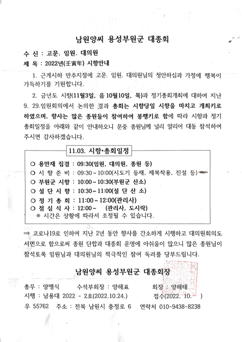 2022년도 용성부원군파 대종회 시행을 아래와 같이 시향하오니 임원을 비롯한 종원들의 참여를 바랍니다.