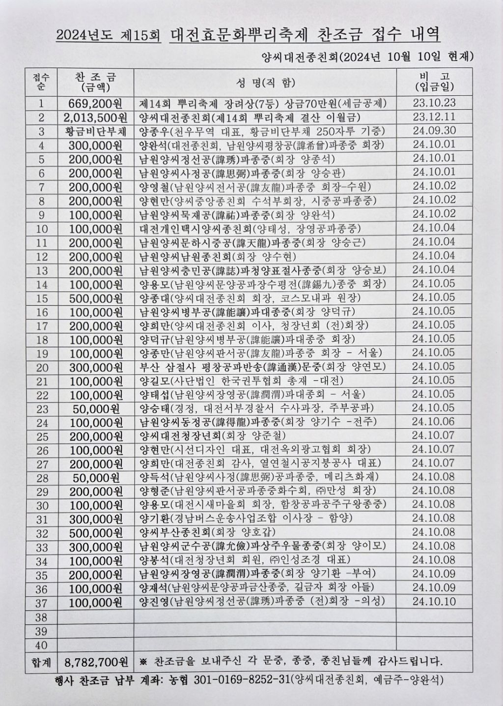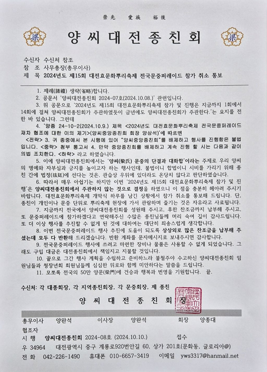 안타깝게도, 2024년도 제15회 대전효문화뿌리축제 전국문중퍼레이드 행사 주관을 양씨대전종친회에서 하지 않는 것으로 하였사오니 양지해 주시기 바랍니다.