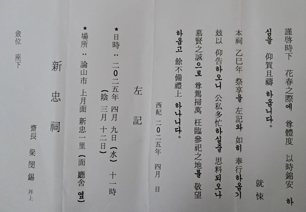 ※ 제향 당일 제38대 충남도지사를 역임한 양승조 종친도 오십니다.