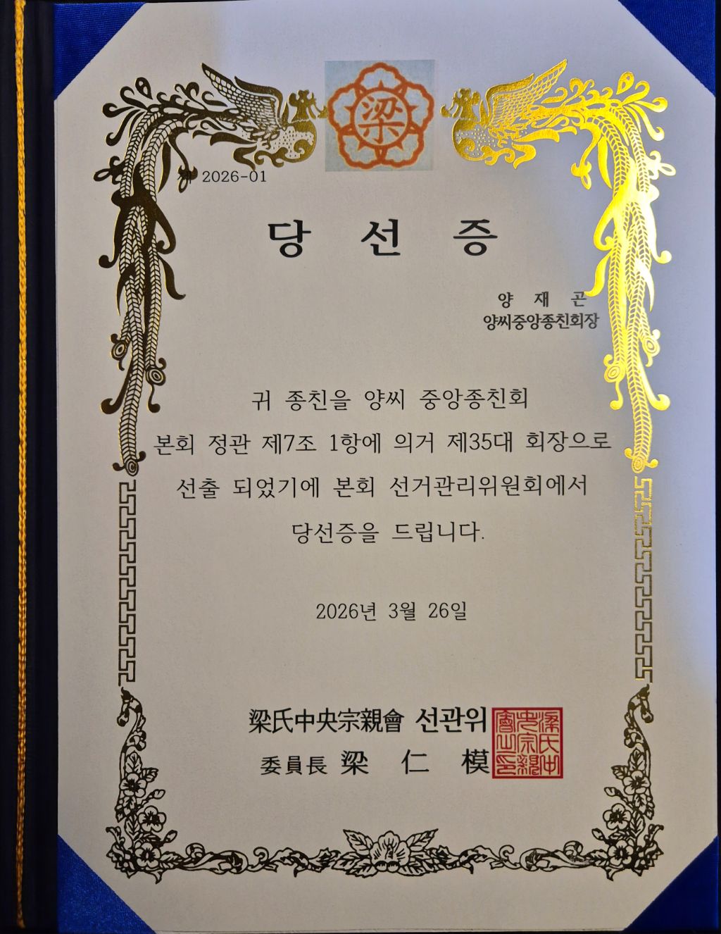 (Ps) 중앙종친회장 추대 되심을 진심으로 경하드리며 감축드립니다. 앞으로 전국에 계신 양씨 제현(諸賢)들을 위한 종사일에 힘쓸 노고를 위해 건강 상하지 않게 하시고 더 나아가 족보와 관련된 편찬 및 간행이 될 수 있는 여건이 되기를 두 손 모아 바랍니다.