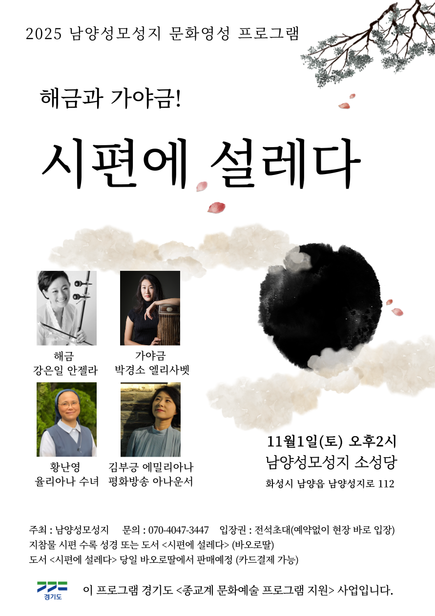 2025년 11월 01(토) 남양성모성지 문화영성 프로그램 해금과 가야금! 시편에 설레다 작성자agnes1|작성시간25.10.25|조회수124 목록 댓글 0 글자크기 작게가 글자크기 크게가 다음검색 현재 게시글 추가 기능 열기 북마크 공유하기 신고 센터로 신고 댓글 댓글 0 댓글쓰기 답글쓰기 댓글 리스트
