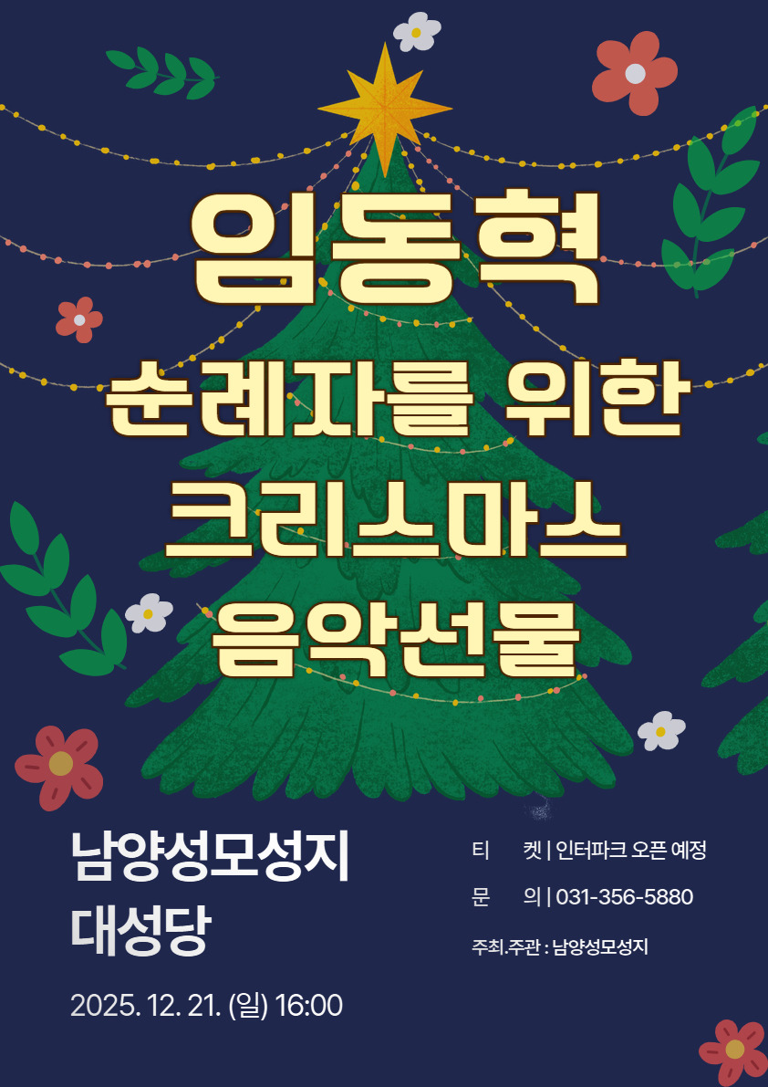 25.12.21 피아니스트 임동혁 순례자를 위한 크리스마스 음악선물 작성자agnes1|작성시간25.12.06|조회수355 목록 댓글 0 글자크기 작게가 글자크기 크게가 2025년 12월 21일피아니스트 임동혁 순례자를 위한 크리스마스 음악선물오후 4시 / 대성당 / Nol 인터파크 예매 (25.12.08일 이후 오픈 예정) 다음검색 현재 게시글 추가 기능 열기 북마크 공유하기 신고 센터로 신고 댓글 댓글 0 댓글쓰기 답글쓰기 댓글 리스트