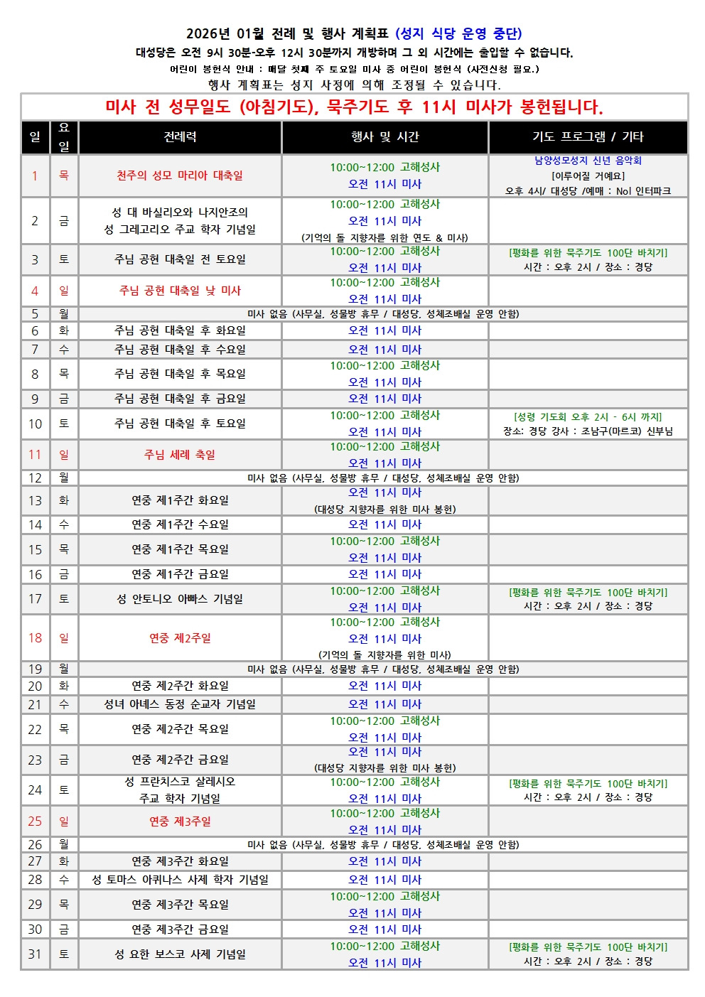 2026년 01월 전례 및 행사표 작성자agnes1|작성시간25.12.21|조회수105 목록 댓글 0 글자크기 작게가 글자크기 크게가 다음검색 현재 게시글 추가 기능 열기 북마크 공유하기 신고 센터로 신고 댓글 댓글 0 댓글쓰기 답글쓰기 댓글 리스트