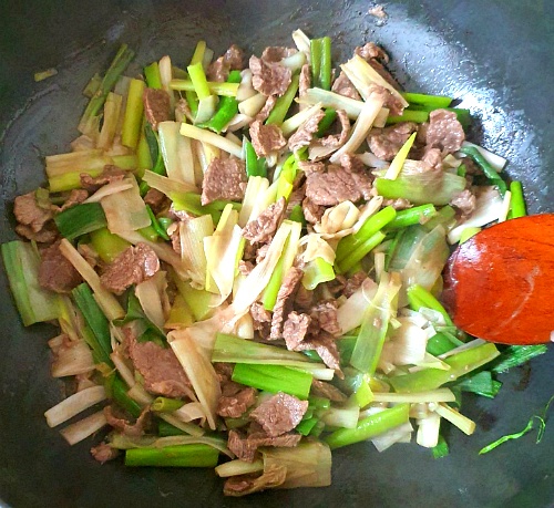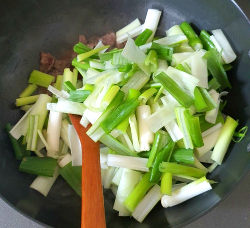 6) 고기가 다 볶아졌다면 대파를 넣어 이어 볶기