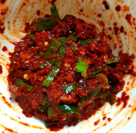 고춧가루 1, 국간장 1, 다진 대파 한 큰 술, 물 2큰술,